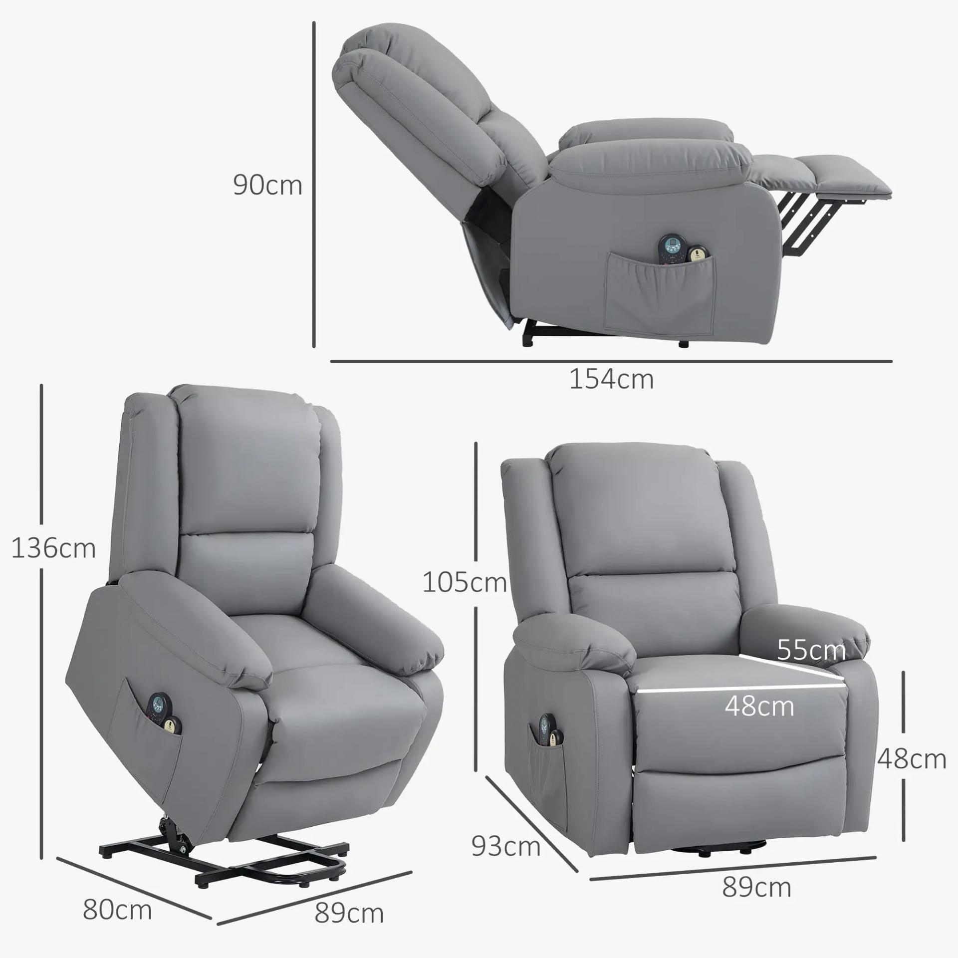 - MEDIDAS TOTALES: 89x93x105 cm (LxANxAL). Medidas reclinado: 89x154x90 cm (LxANxAL). Medidas cuando está elevado: 89x80x136 cm (LxANxAL). Este sillón relax levanta personas es ideal para usuarios de hasta 185 cm y 150 kg. Requiere montaje