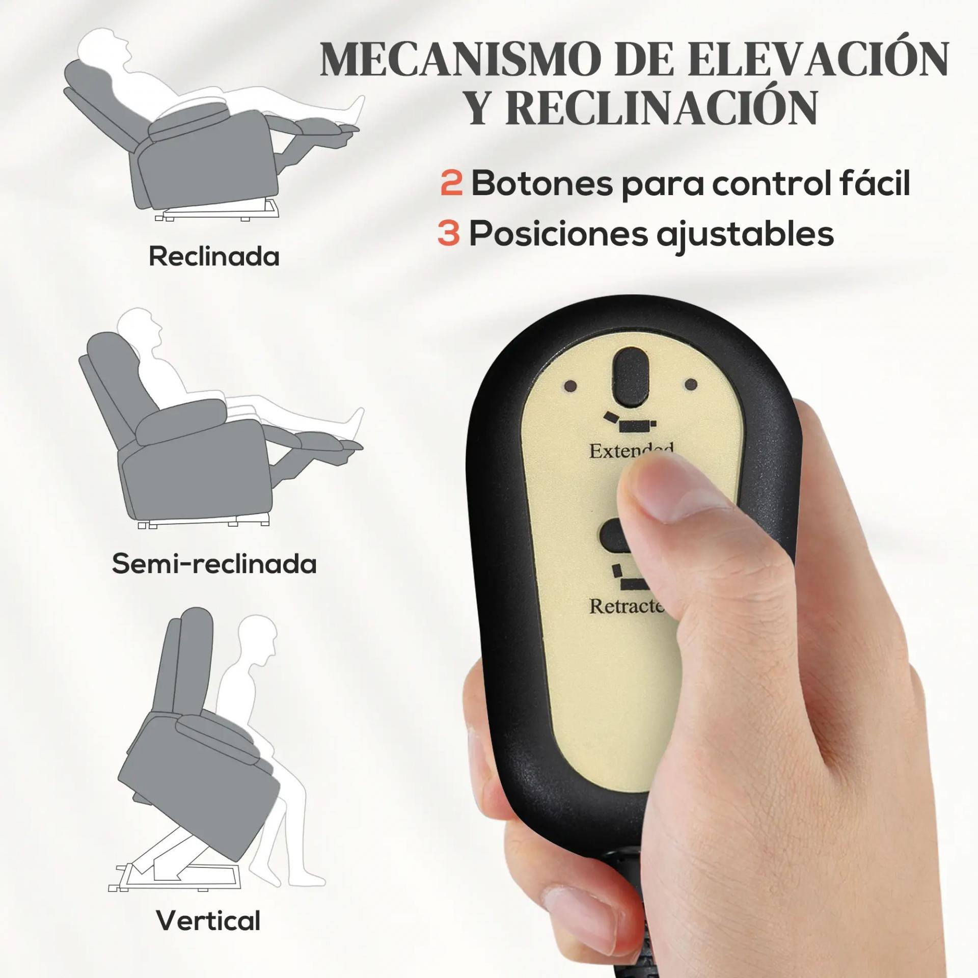 - ELEVACIÓN Y RECLINAMIENTO ELÉCTRICO: Este sillón relax eléctrico tiene un sistema de elevación de 45° y reclinación de hasta 155°, controlados por mandos a distancia, para ajustar fácilmente a la posición más cómoda