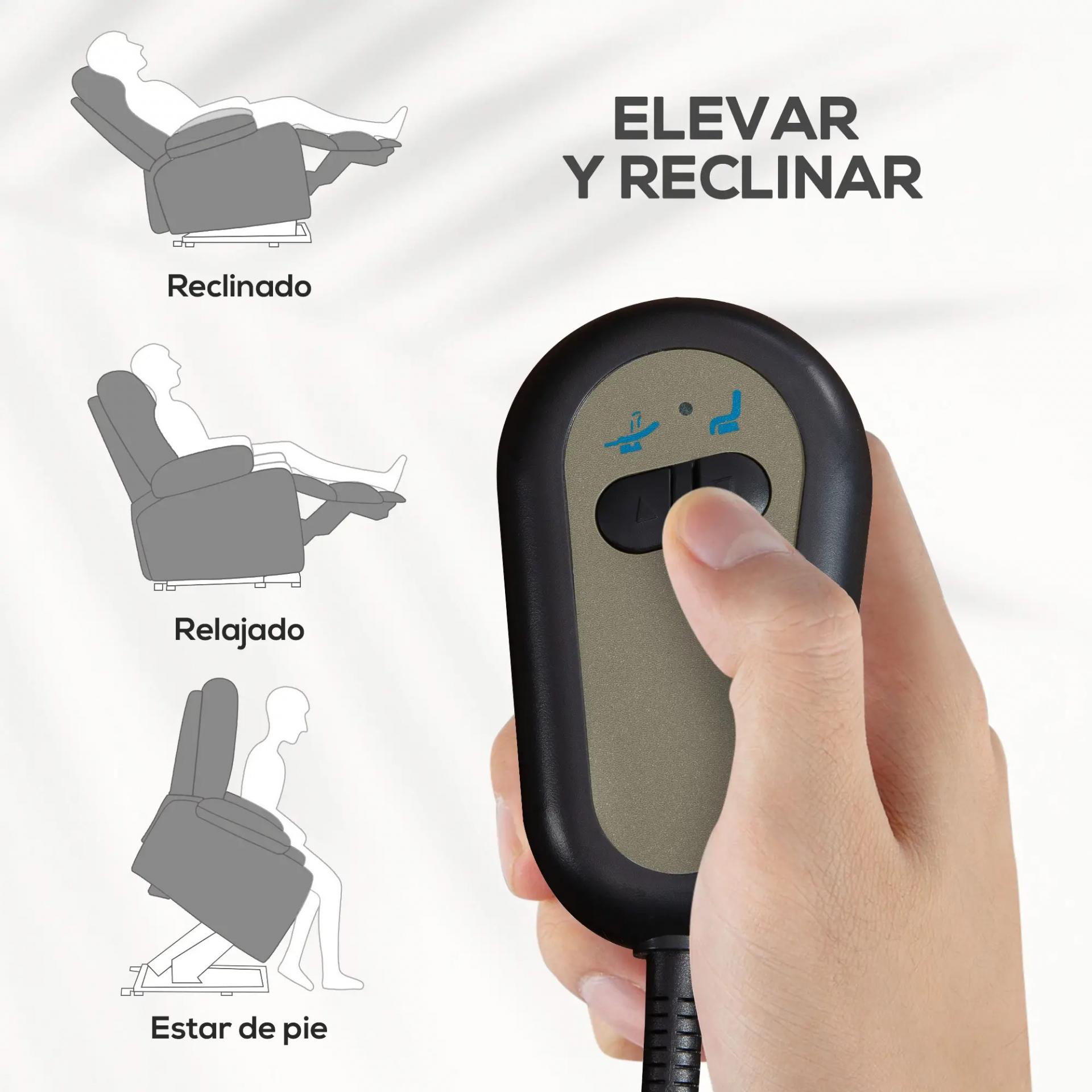 SILLÓN CON ELEVACIÓN: Sillón relax reclinable ideal para personas mayores o con movilidad reducida. Su sistema de elevación ayuda a pasar de sentado a de pie con mínimo esfuerzo, elevando el asiento hasta un ángulo máximo de 45°