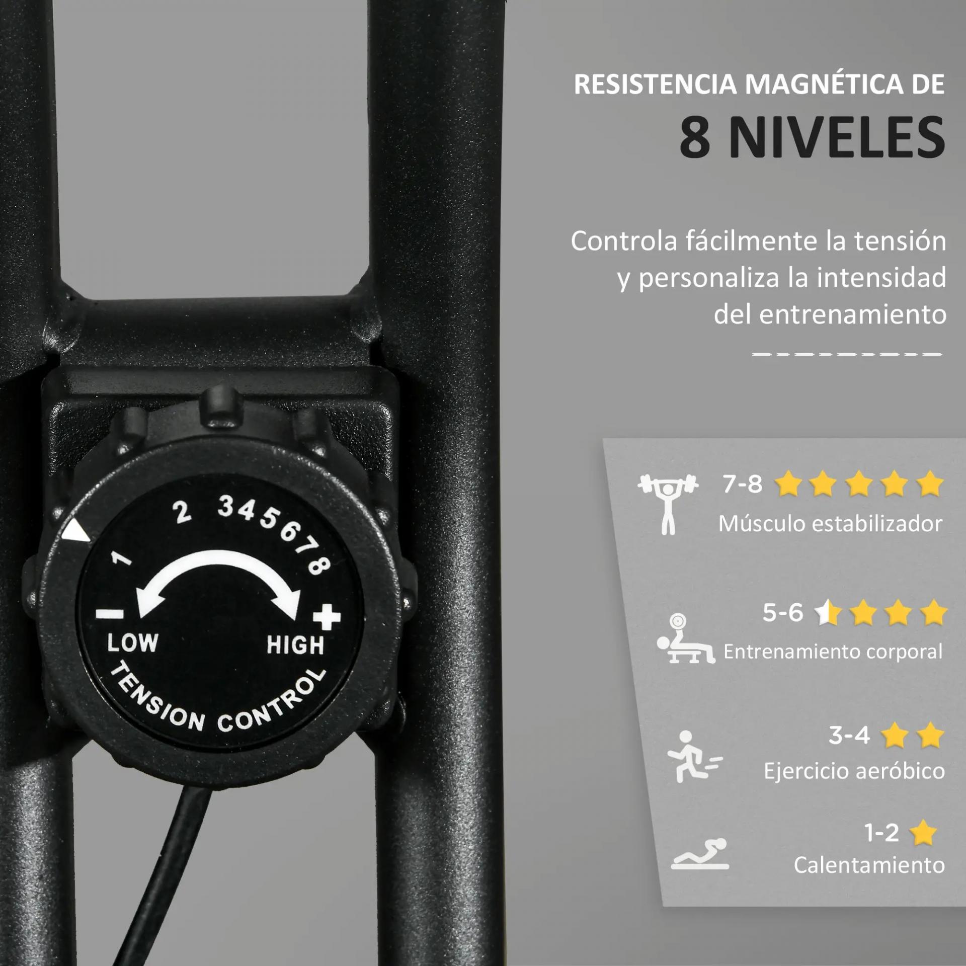 BICICLETA ESTÁTICA CON RESISTENCIA AJUSTABLE: Esta bicicleta estática está construida con un sistema de control de tensión magnética. Con 8 niveles de tensión, podrás ajustar el nivel de intensidad según la intensidad del ejercicio que desees realizar. Además, cuenta con un volante de inercia de 1,6 kg de alta resistencia que te garantiza una experiencia de conducción suave y silenciosa