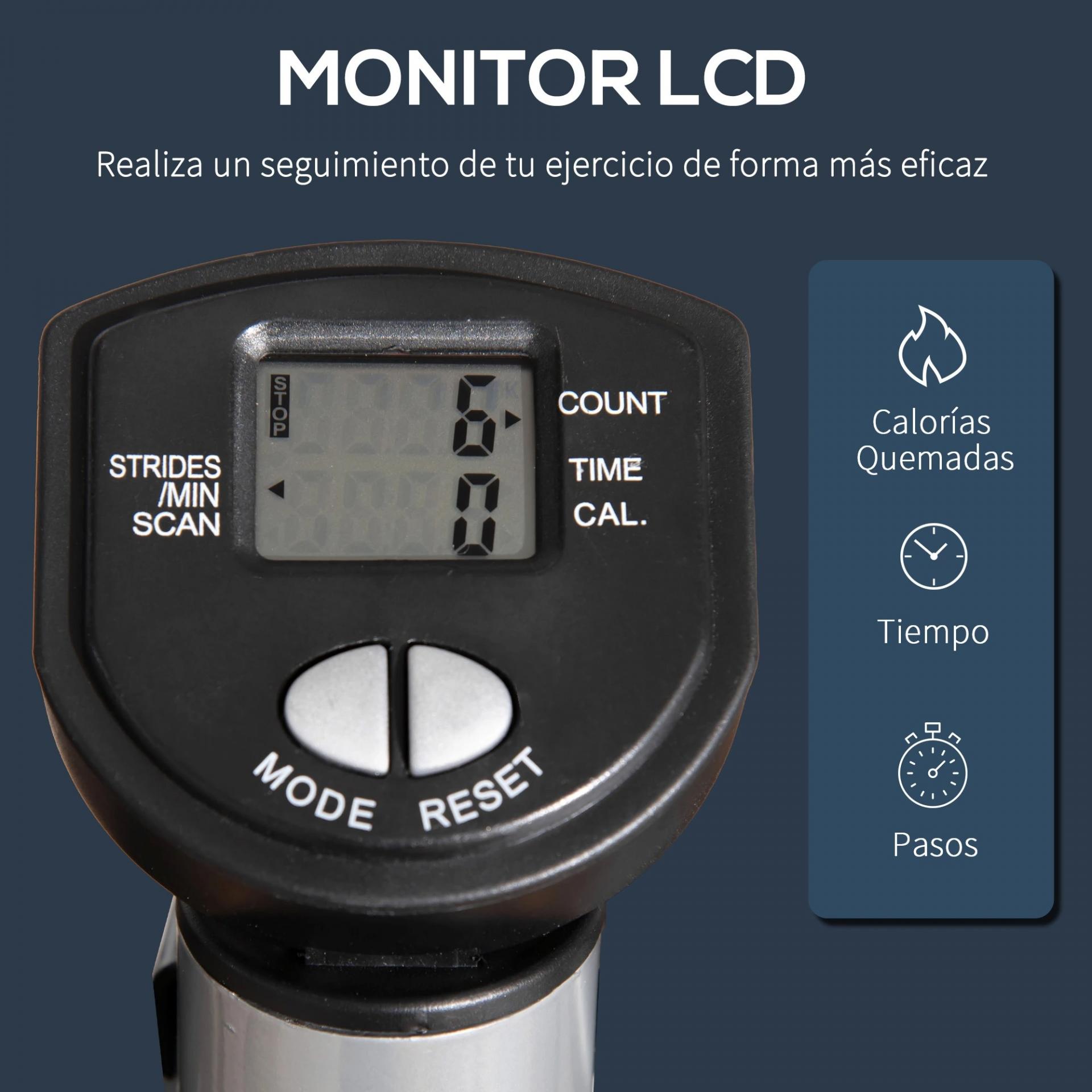 - PANTALLA LCD: Esta máquina de subir escaleras lleva incorporada una pantalla LCD para rastrear el progreso de tu entrenamiento controlando el tiempo de ejercicio, las calorías quemadas y el recuento de pasos