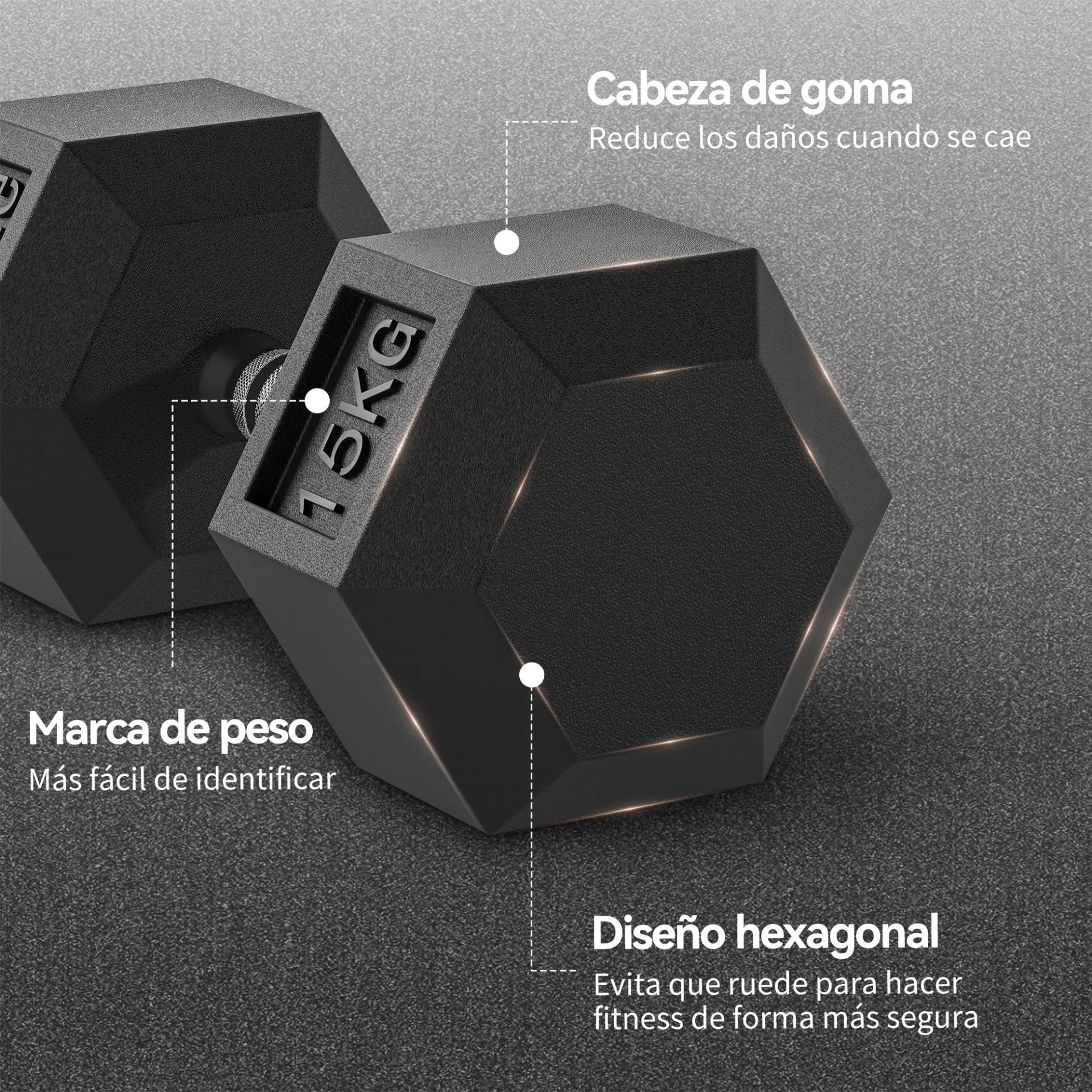 Set de 2 Mancuernas Hexagonales de 2 x 15 kg de Hierro Fundido Recubiertas en Goma para Entrenamiento en Casa Gimnasio
