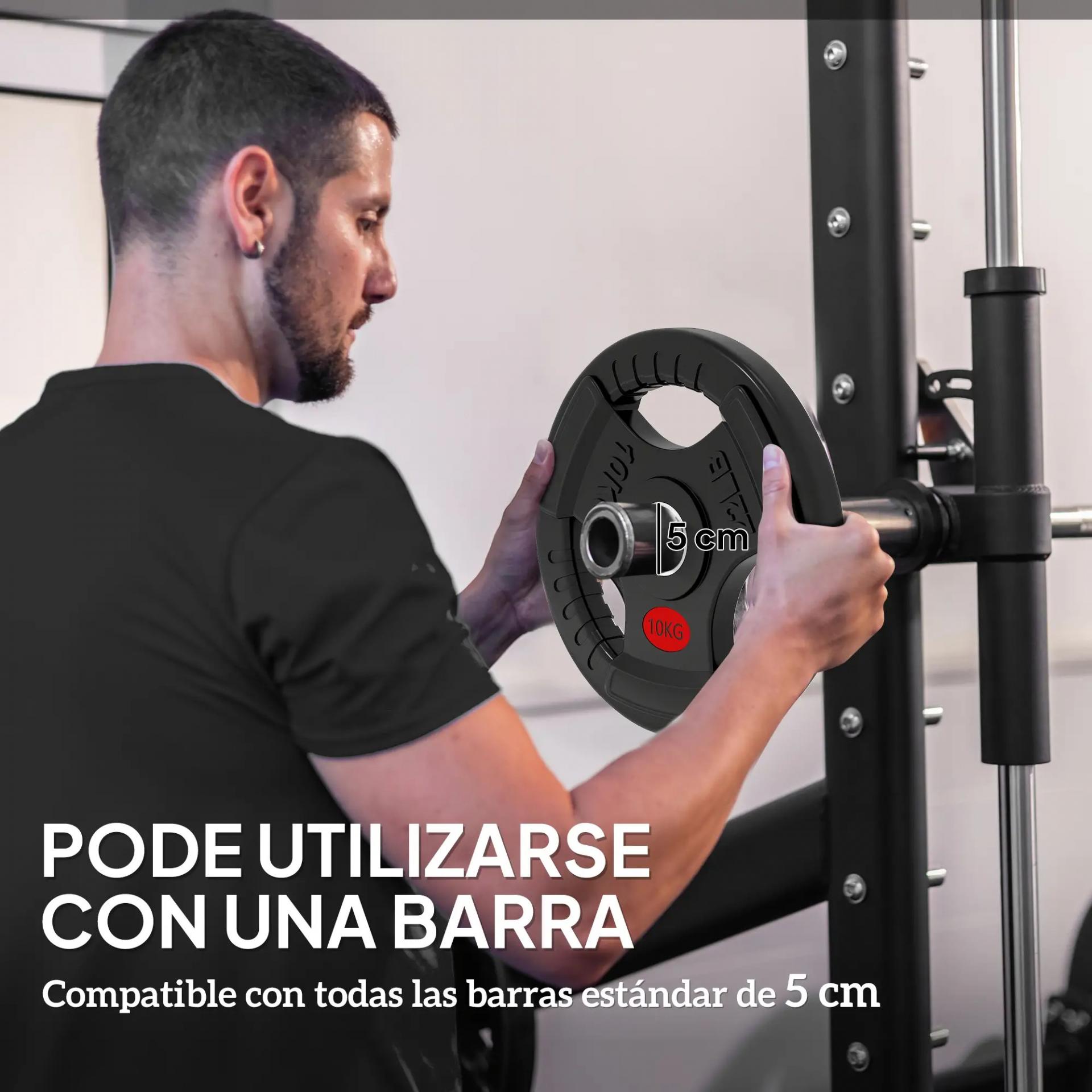 - TRIPLE AGARRE ERGONÓMICO: Gracias a sus tres orificios laterales, cada disco de pesa se puede utilizar con o sin barra, permitiendo realizar ejercicios variados como sentadillas, giros o zancadas con mayor comodidad y seguridad
