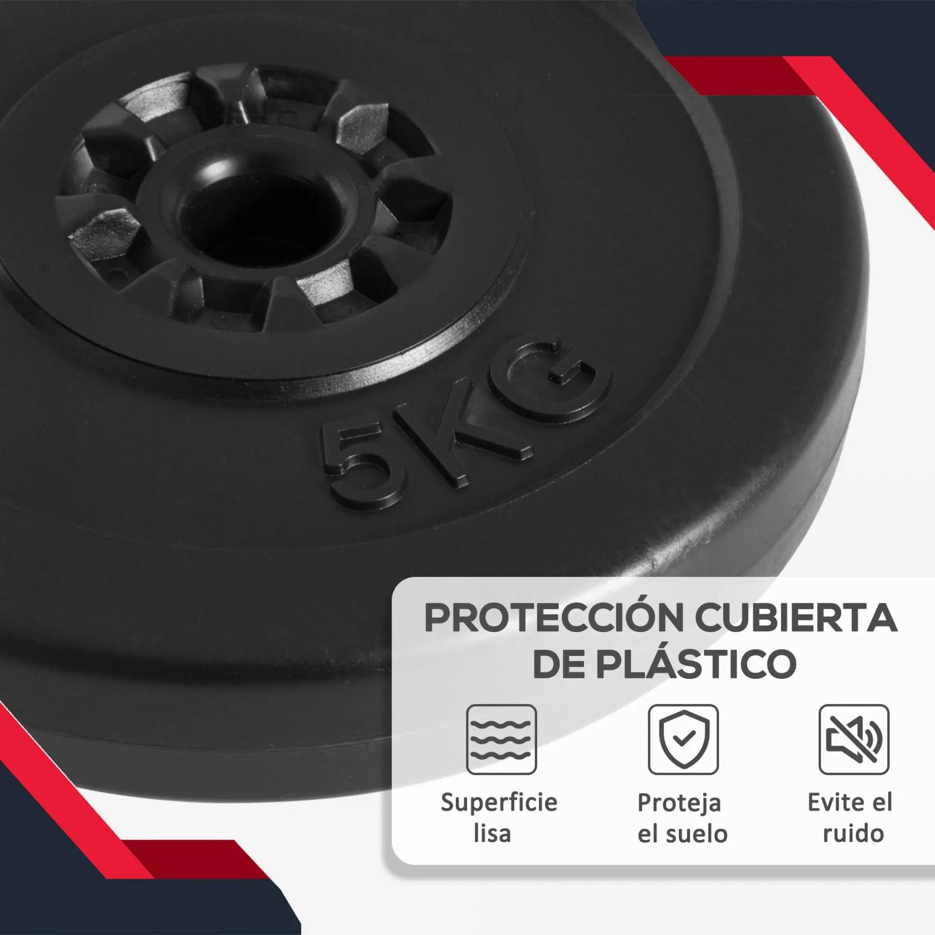 MEDIDAS TOTALES: Medidas de cada pesa de 5 kg: Ø26,5x4,5 cm (DiámxAL); Medidas de cada pesa de 10 kg: Ø32x5,5 cm (DiámxAL); Diámetro del orificio de los discos: Ø2,5 cm. Nota: SOLO incluye los discos, la barra NO está incluida