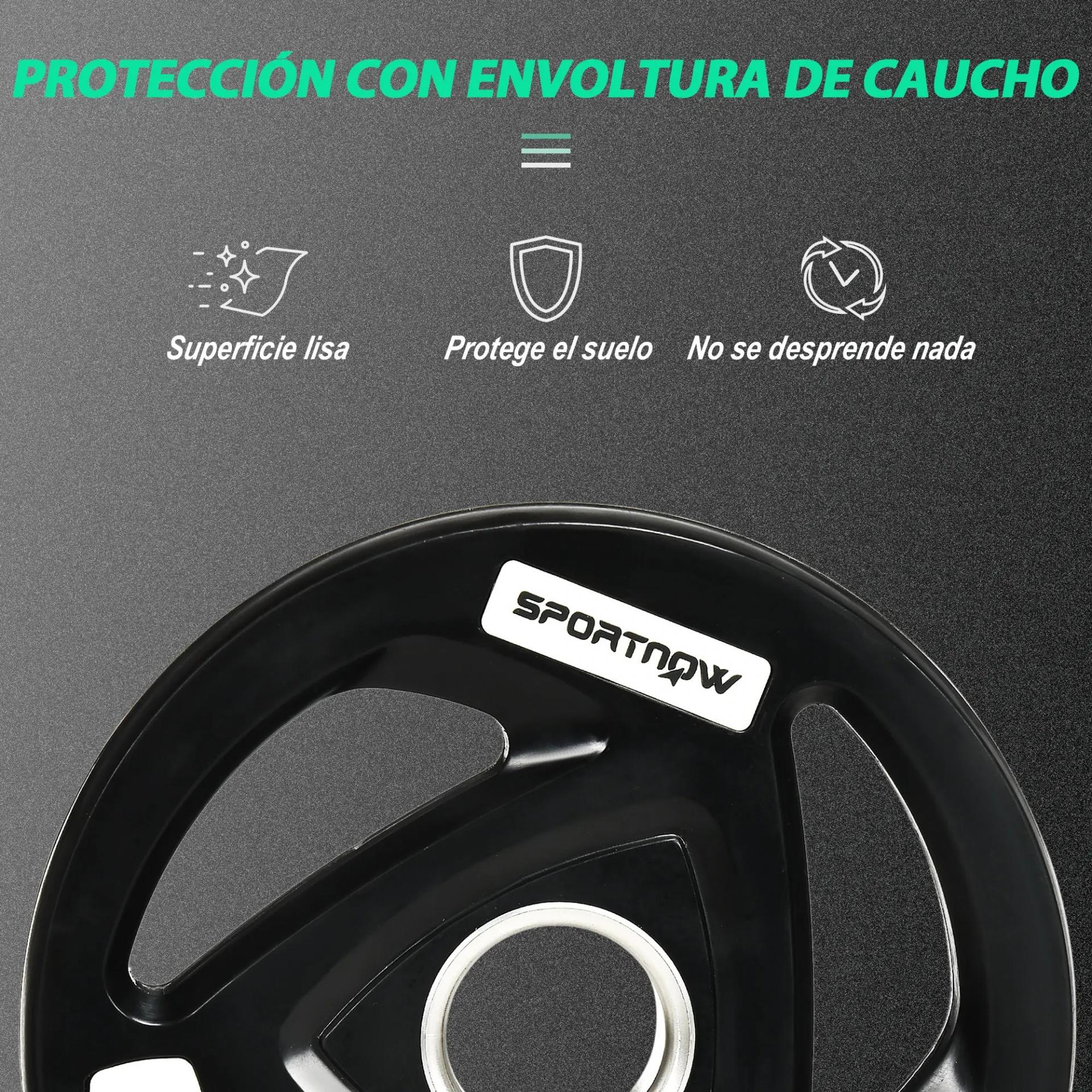 - ENVOLTURA DE CAUCHO: El recubrimiento de caucho de discos olimpicos, además de proporcionar mayor resistencia a la corrosión, también reduce el ruido en caso de caída