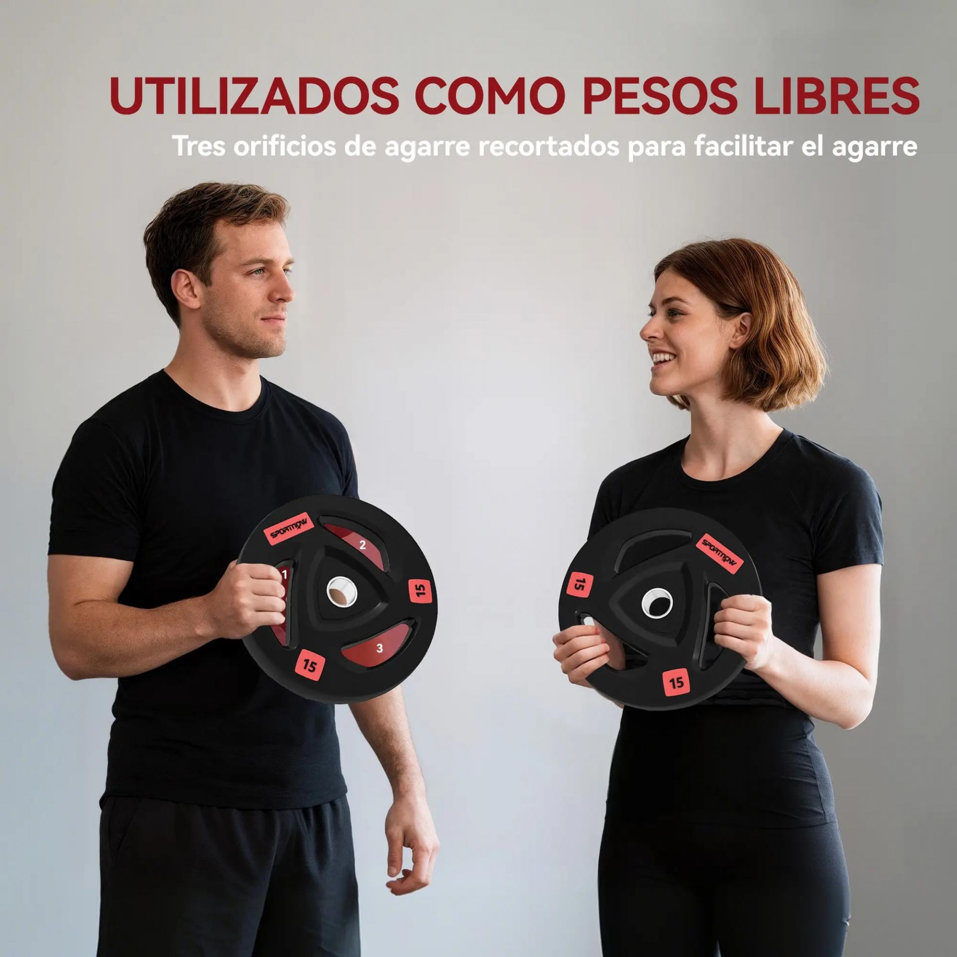 - PARA COMPLEMENTAR CON UNA BARRA DE PESAS: Creadas con orificios de 5 cm, estos discos de pesas tienen el tamaño adecuado para las barras olímpicas estándar y otras barras especiales como la barra de curl, la barra trap y la barra de sentadillas