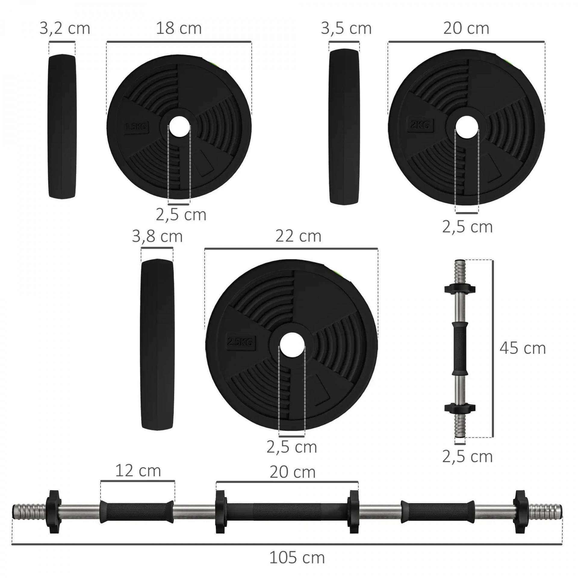 SET DE 25 KG: El set de mancuernas incluye discos de diferentes pesos (4 x 2,5 kg, 4 x 2 kg, 4 x 1,5 kg) y dos barras de 0,5 kg cada una. Puedes ajustar el peso a tu gusto