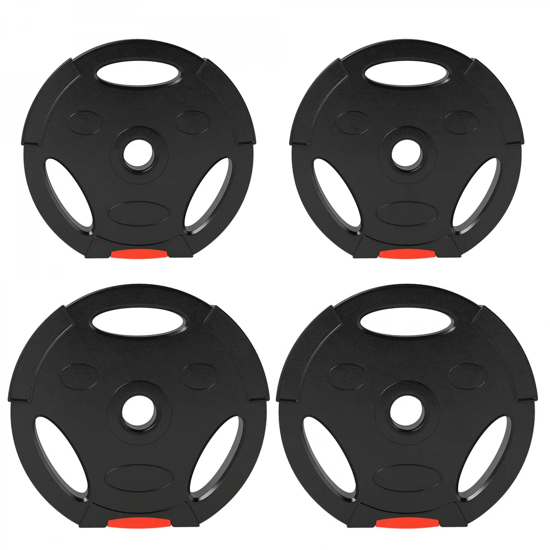 - TRES ORIFICIOS DE AGARRE: Cada disco de pesa tiene tres orificios recortados para un agarre más fácil y seguro durante tus entrenamientos de peso sin barra, y para colocarlos en las mismas