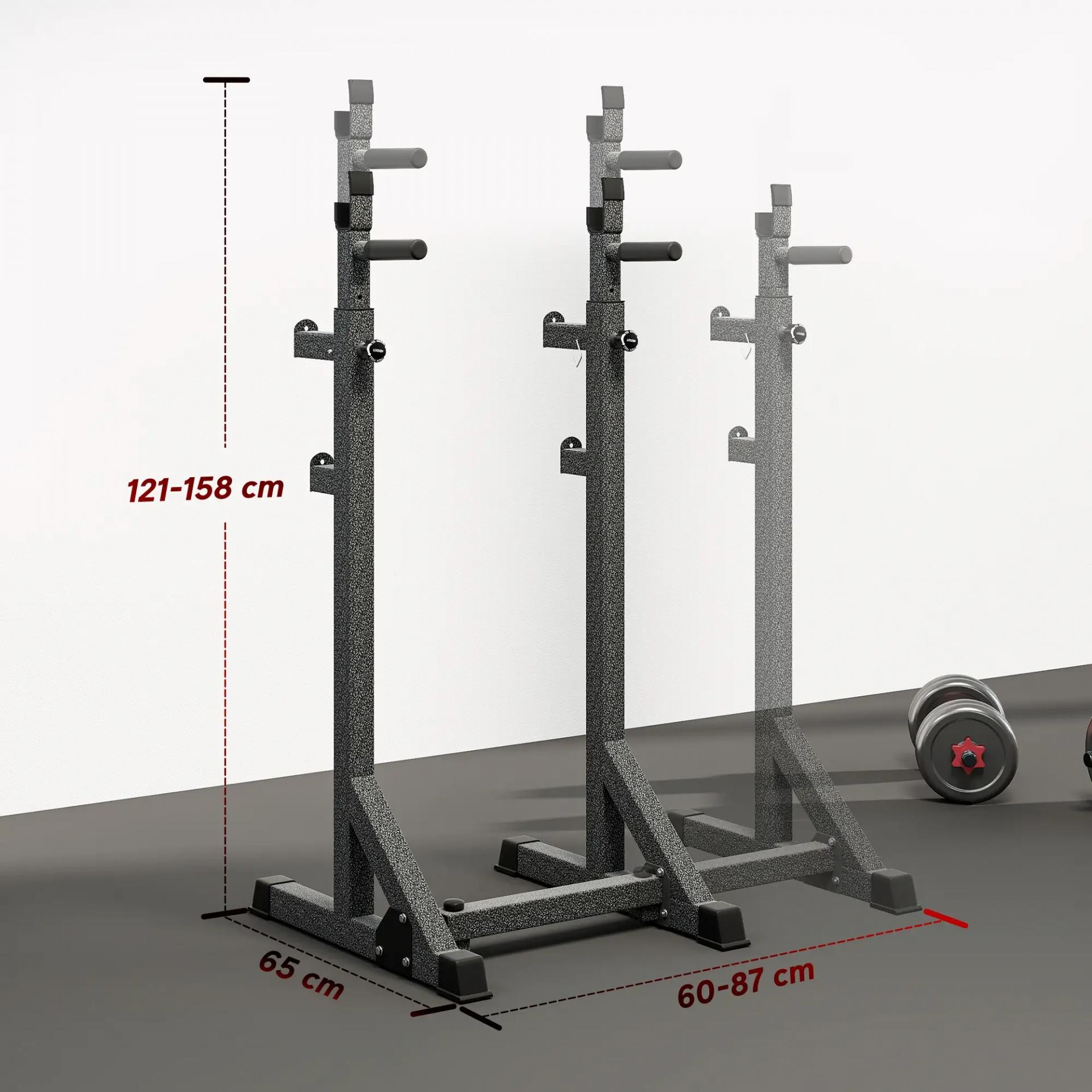 FÁCIL DE AJUSTAR: Las manecillas giratorias permiten ajustar fácilmente la altura y el ancho del soporte para pesas en 10 niveles, de 121 a 158 cm de altura, y de 60 a 87 cm de ancho