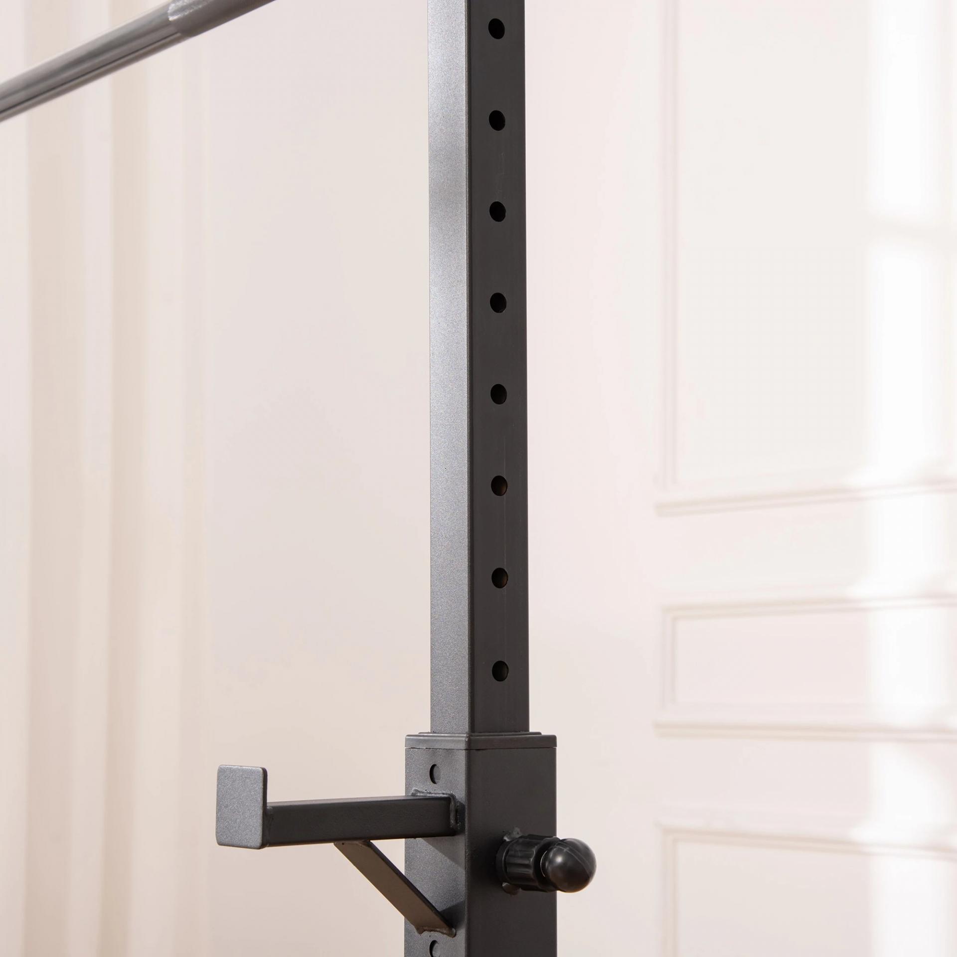- MÁXIMA SEGURIDAD: Las patas de este conjunto tienen tapas protectoras antideslizantes, para proporcionar la adherencia al suelo, y evitar que se mueva durante la práctica de ejercicio o raye el suelo. Los soportes cuentan con un gancho para fijar la altura