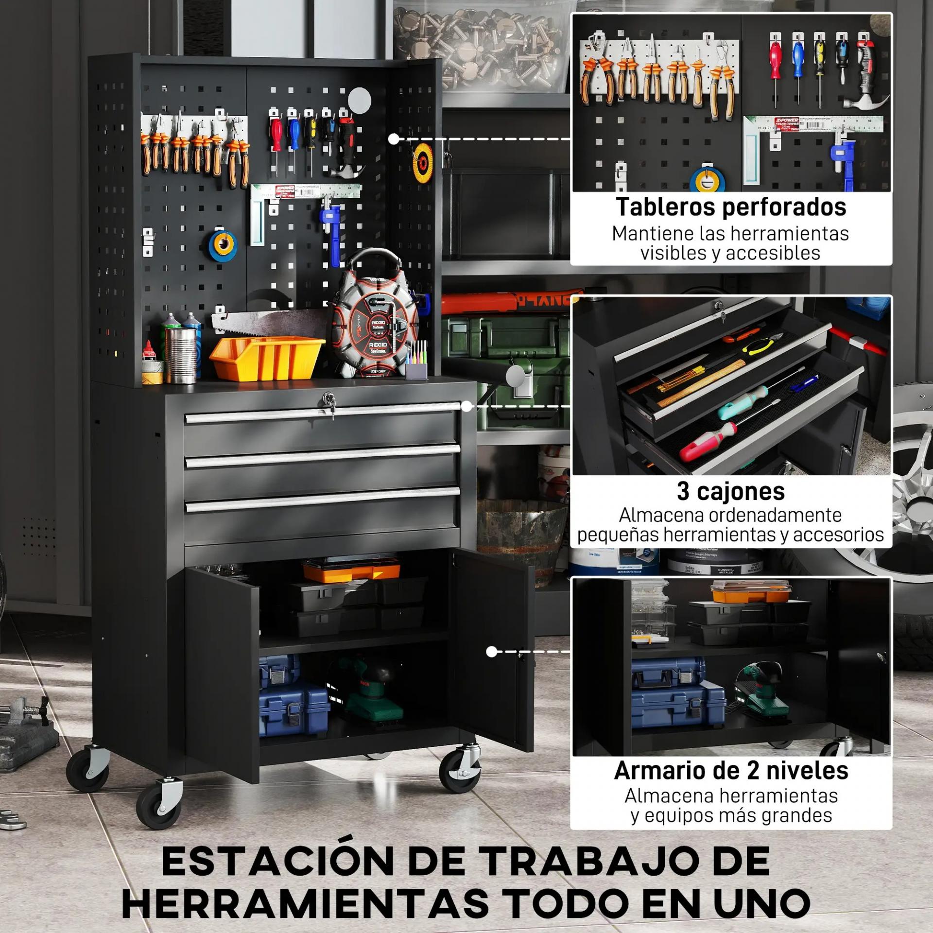 TRABAJA EN ORDEN Y COMODIDAD: Este carro de herramientas de HOMCOM combina tablero perforado, tres cajones, armario de dos niveles y amplia encimera, para mantener tu garaje organizado y las herramientas siempre a mano