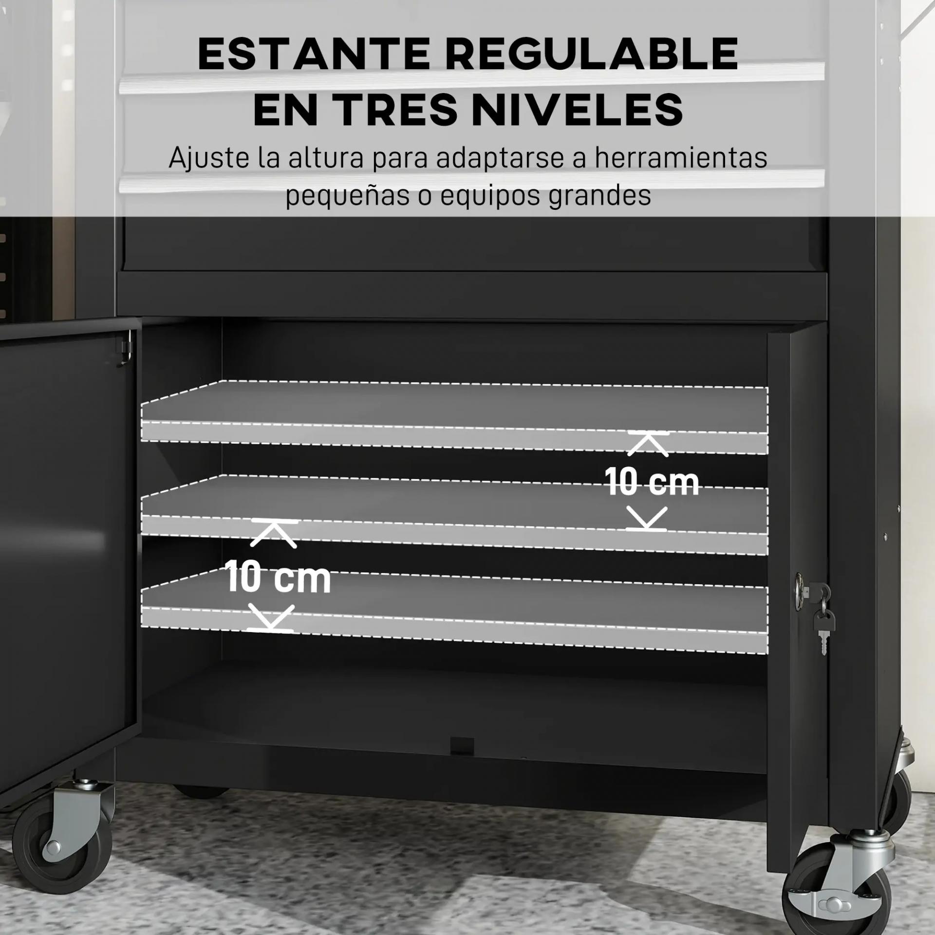 - ESTANTE AJUSTABLE EN ALTURA: El armario inferior del carro de herramientas incluye un estante regulable en tres posiciones, perfecto para guardar desde herramientas pequeñas hasta equipos eléctricos de mayor tamaño, adaptándose a tus necesidades