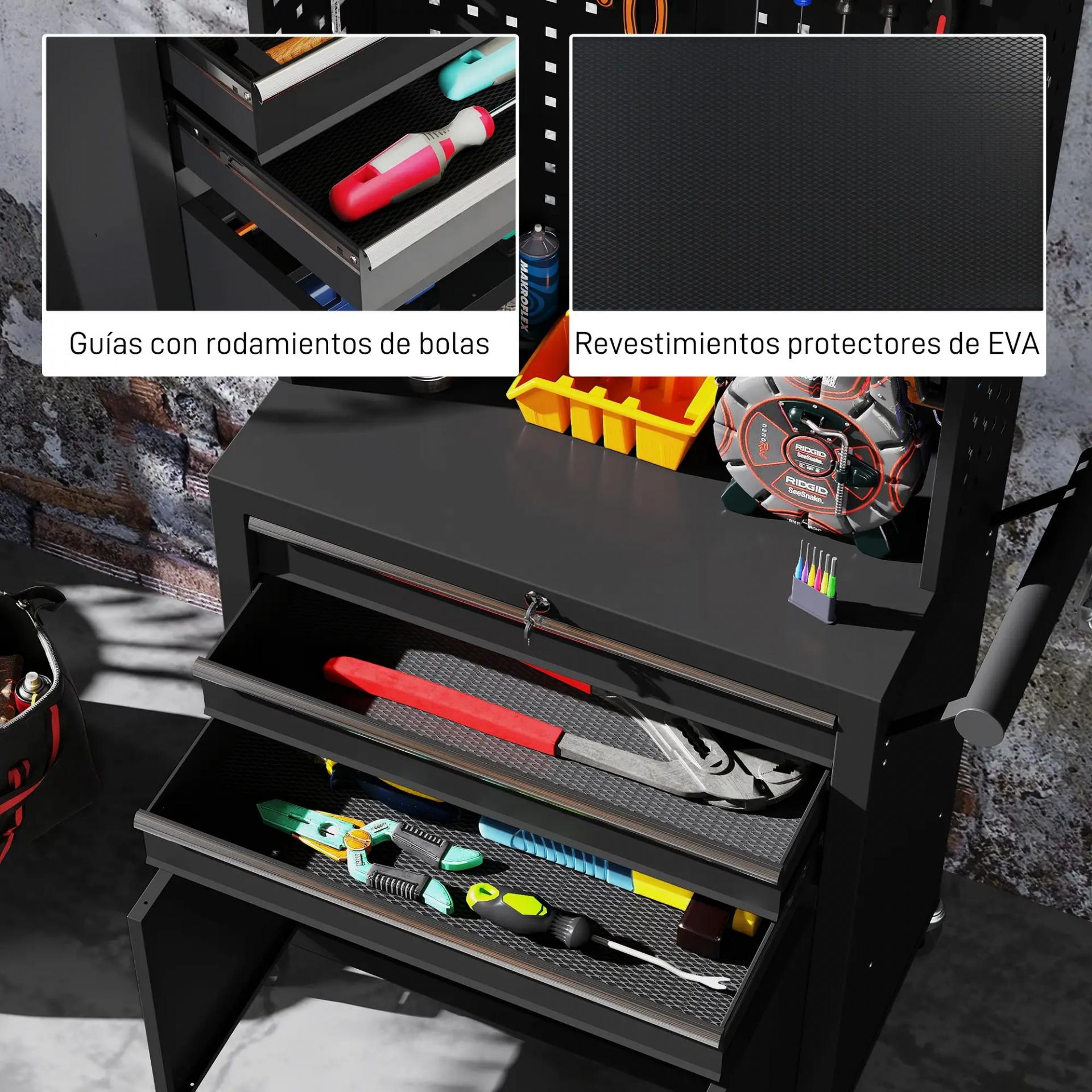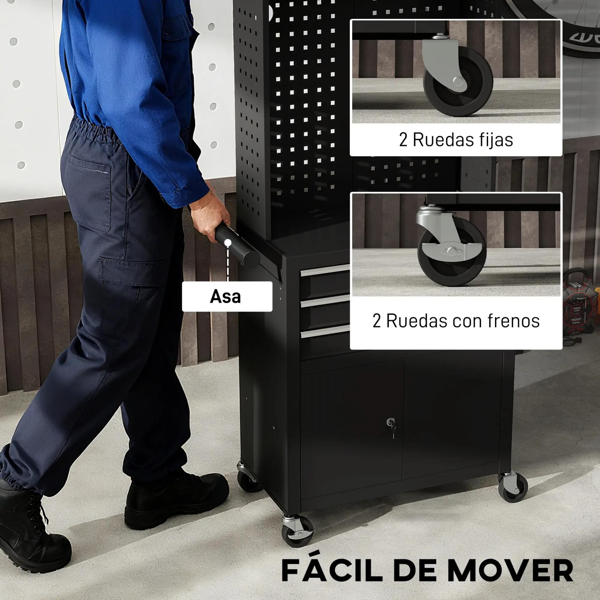 Carro de Herramientas con 3 Cajones Tabla de Pegboard Cerradura por Llave Estante Ajustable 2 Ruedas con Freno Negro