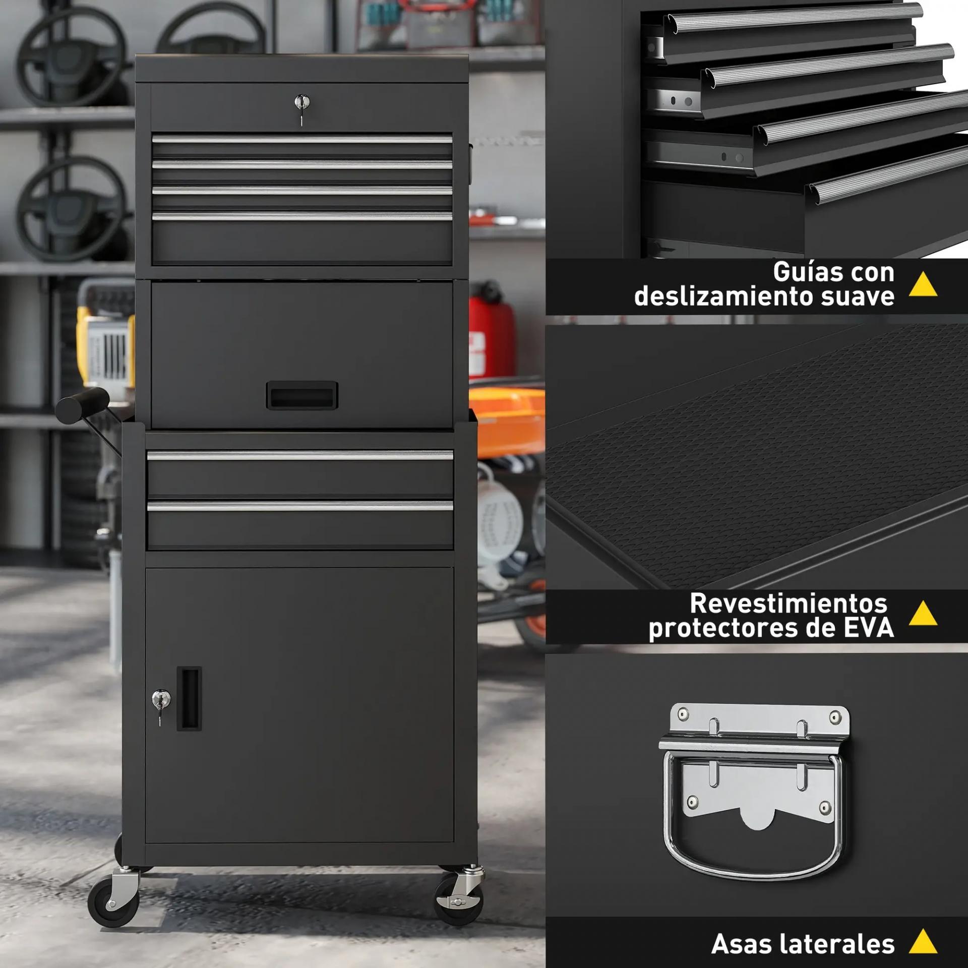 - CIERRE SEGURO: La caja superior del armario bloquea la tapa y los cajones superiores al mismo tiempo con llave. El compartimento inferior cuenta con cierre propio, manteniendo las herramientas protegidas y el espacio ordenado en todo momento