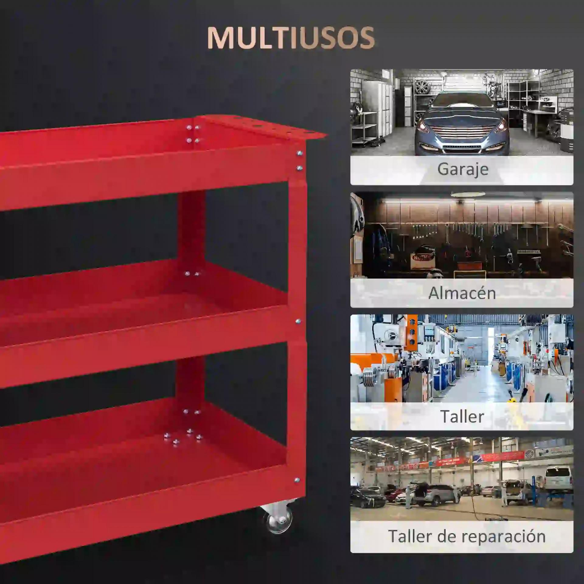 Carro de Taller de Acero con 3 Estantes de Almacenamiento y Asa Lateral Carga 150 kg 83x35,3x76 cm Rojo