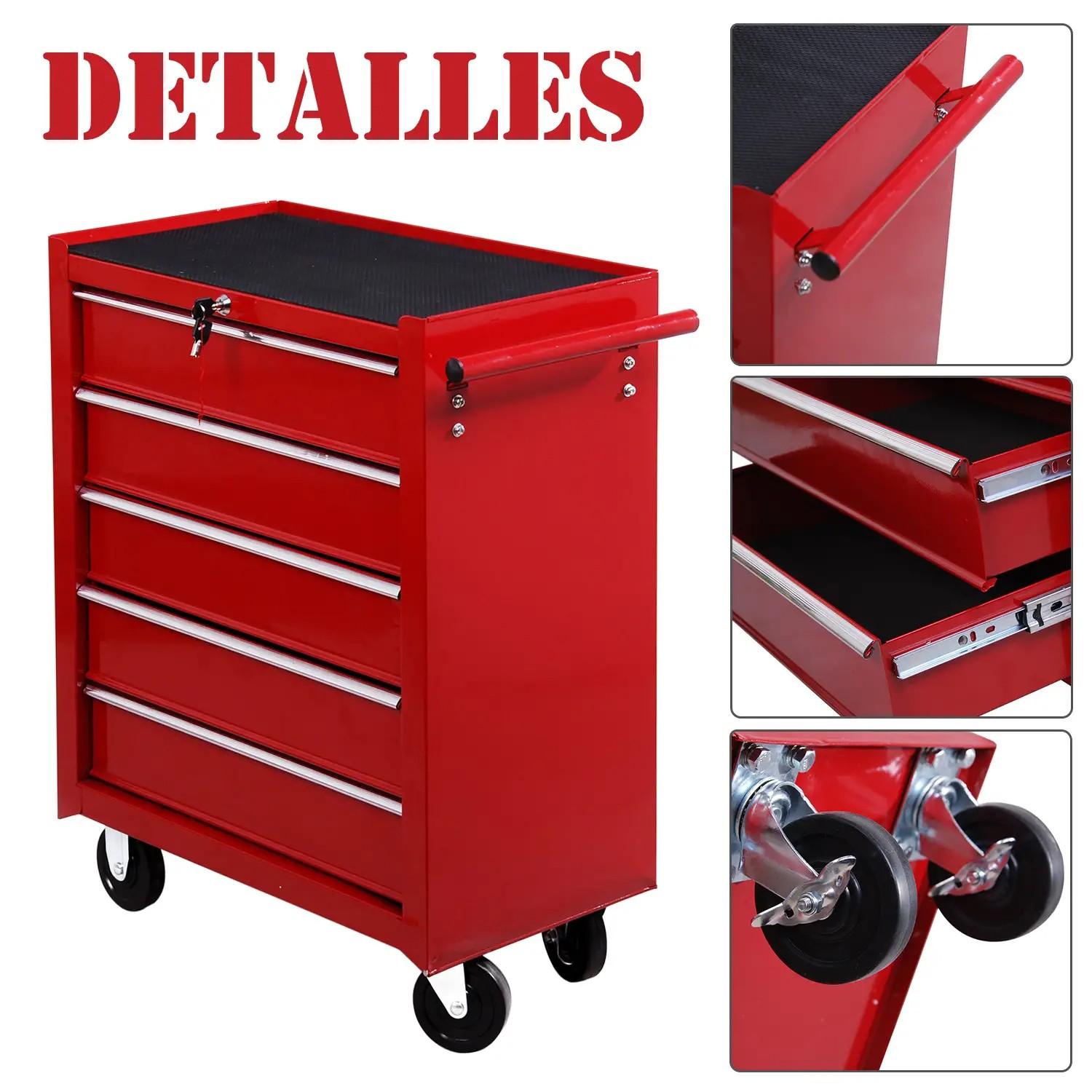 Carro caja de herramientas taller movil con 5 cajones 4 ruedas chapa de Acero Rojo