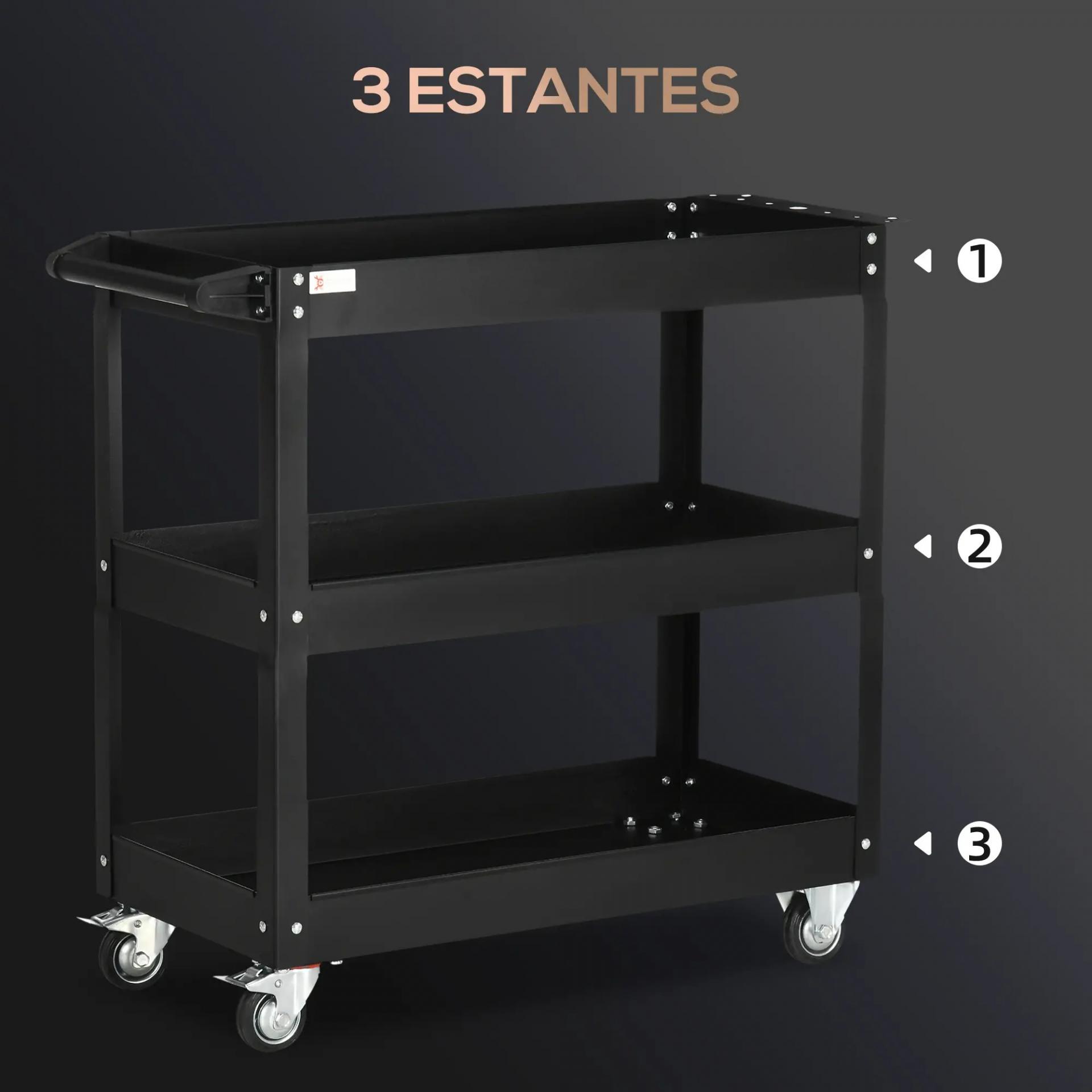 Carro de Herramientas con Ruedas 3 Estantes y Asa Lateral para Garaje Mecánico Hogar 83x35,3x76 cm Negro