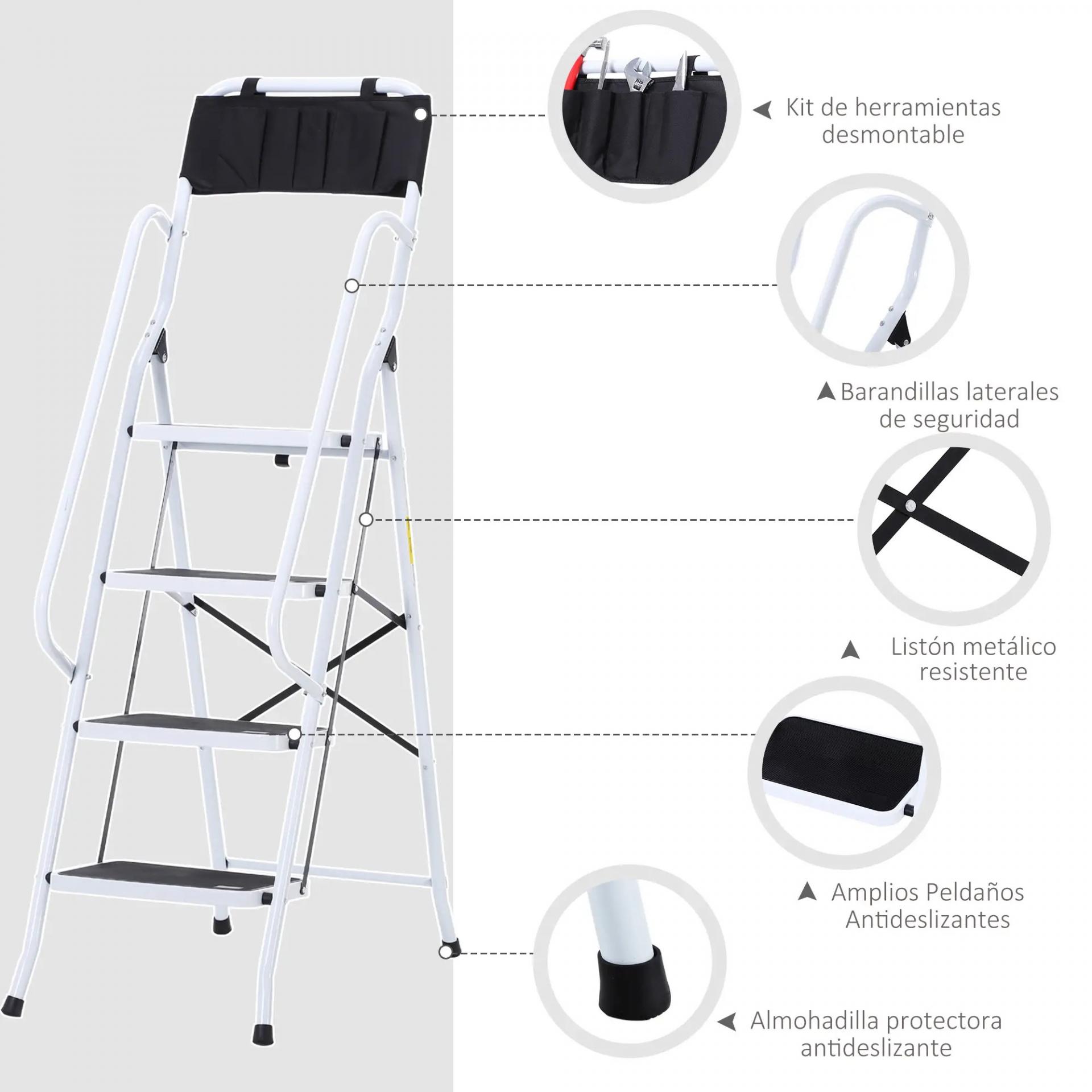 Escalera Plegable de 4 Peldaños Escalera de Tijera con Apoyabrazos y Portaherramientas 50x83x155 cm Blanco y Negro