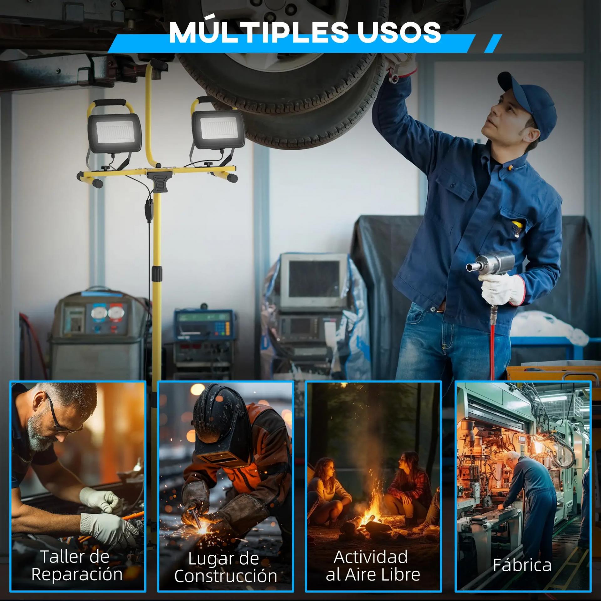 - VERSÁTIL Y PRÁCTICO: Con un diseño de doble cabeza y un mango fácil de manejar, este foco se puede emplear con o sin su trípode metálico incluido, ofreciendo varias opciones de montaje para adaptarse a diferentes situaciones de trabajo