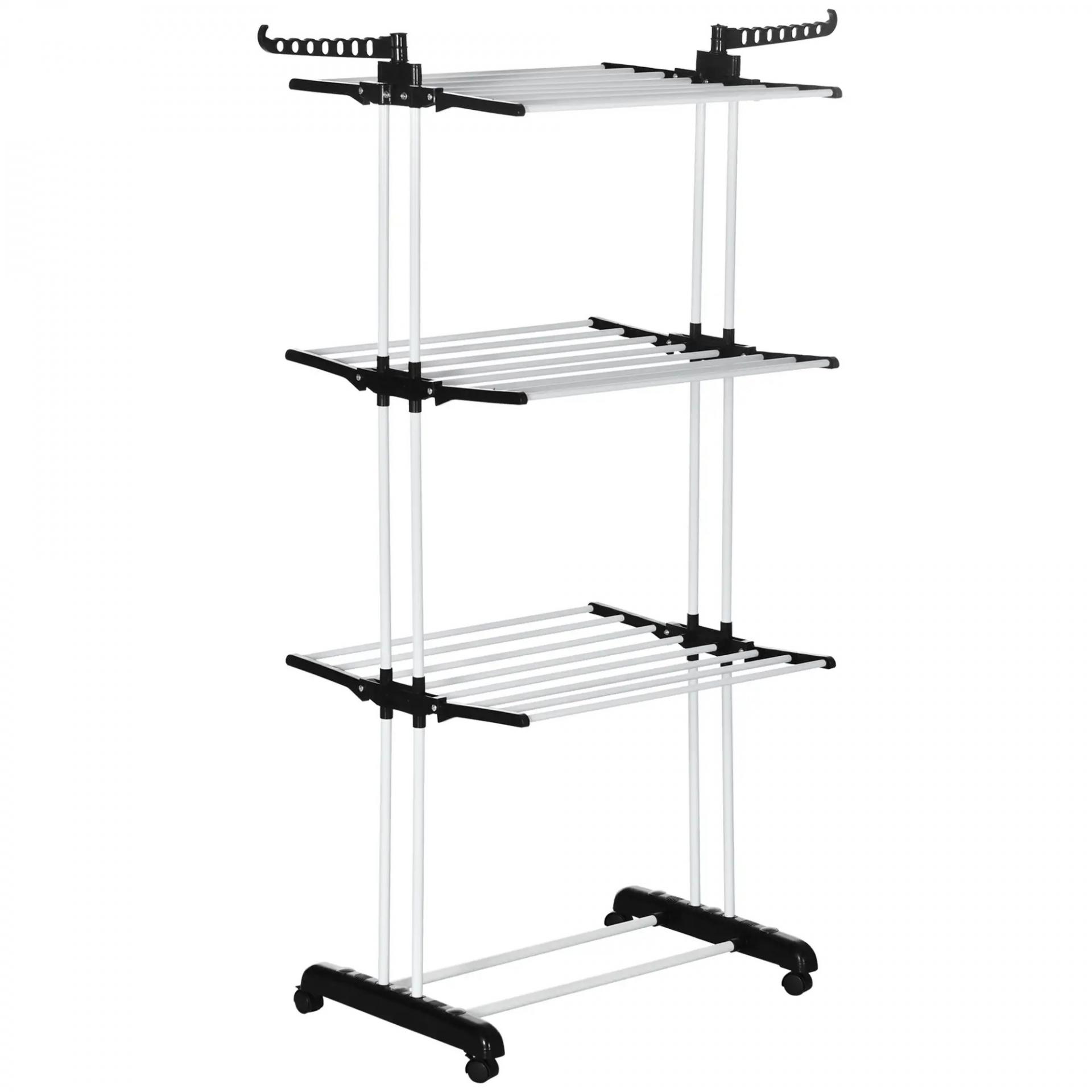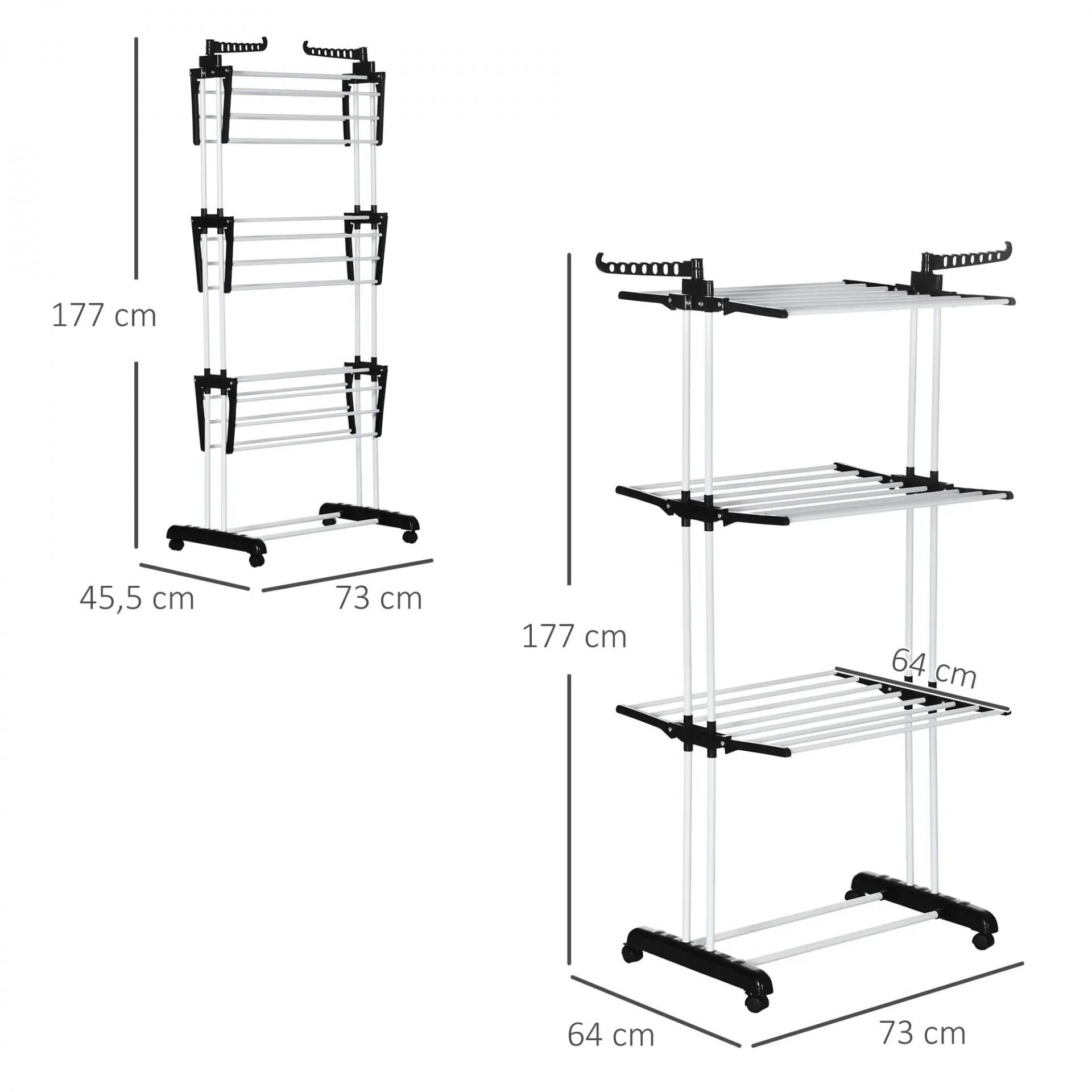 Tendedero de Ropa Plegable con Ruedas 3 Niveles con Alas Plegables y Colgadores 73x64x172 cm Negro y Blanco