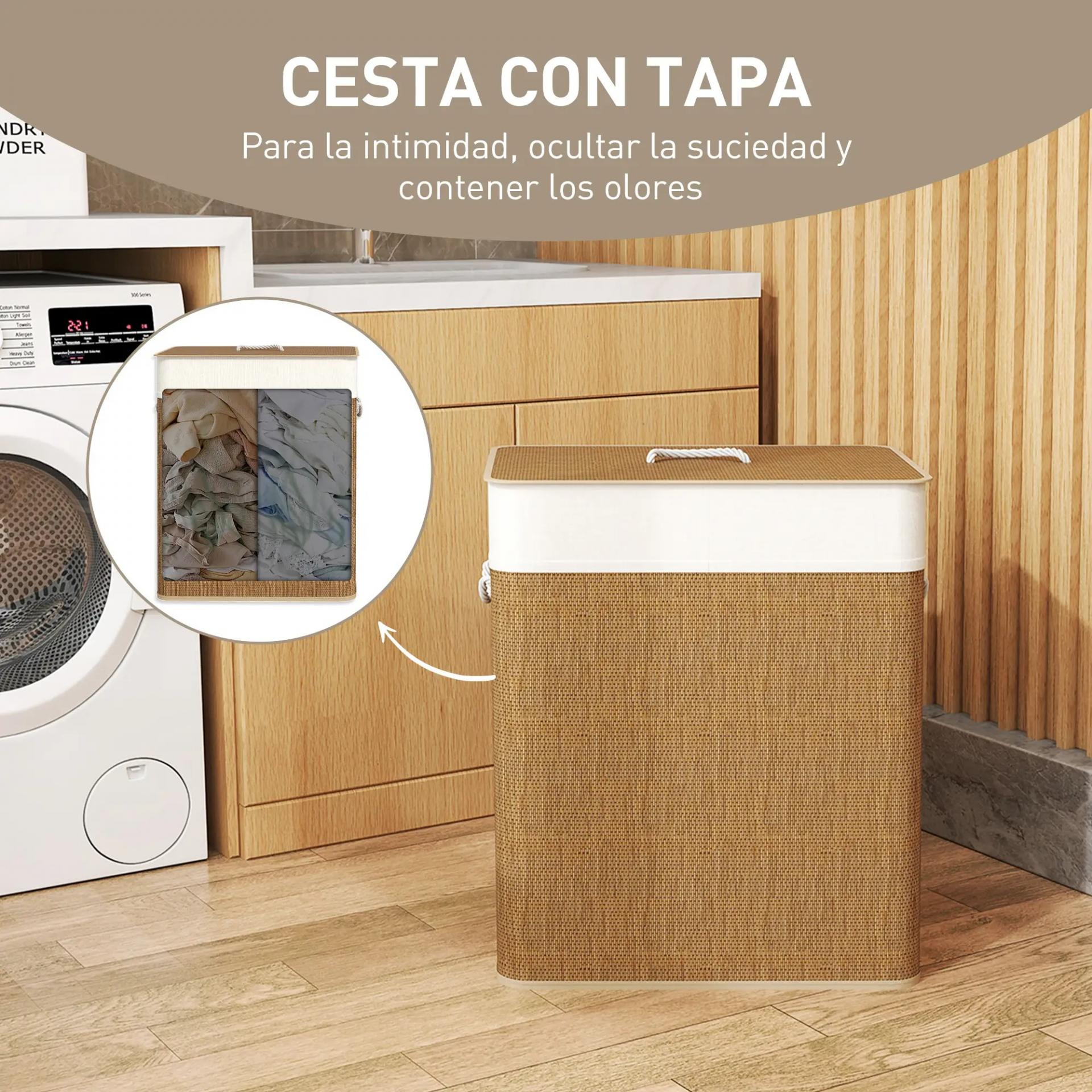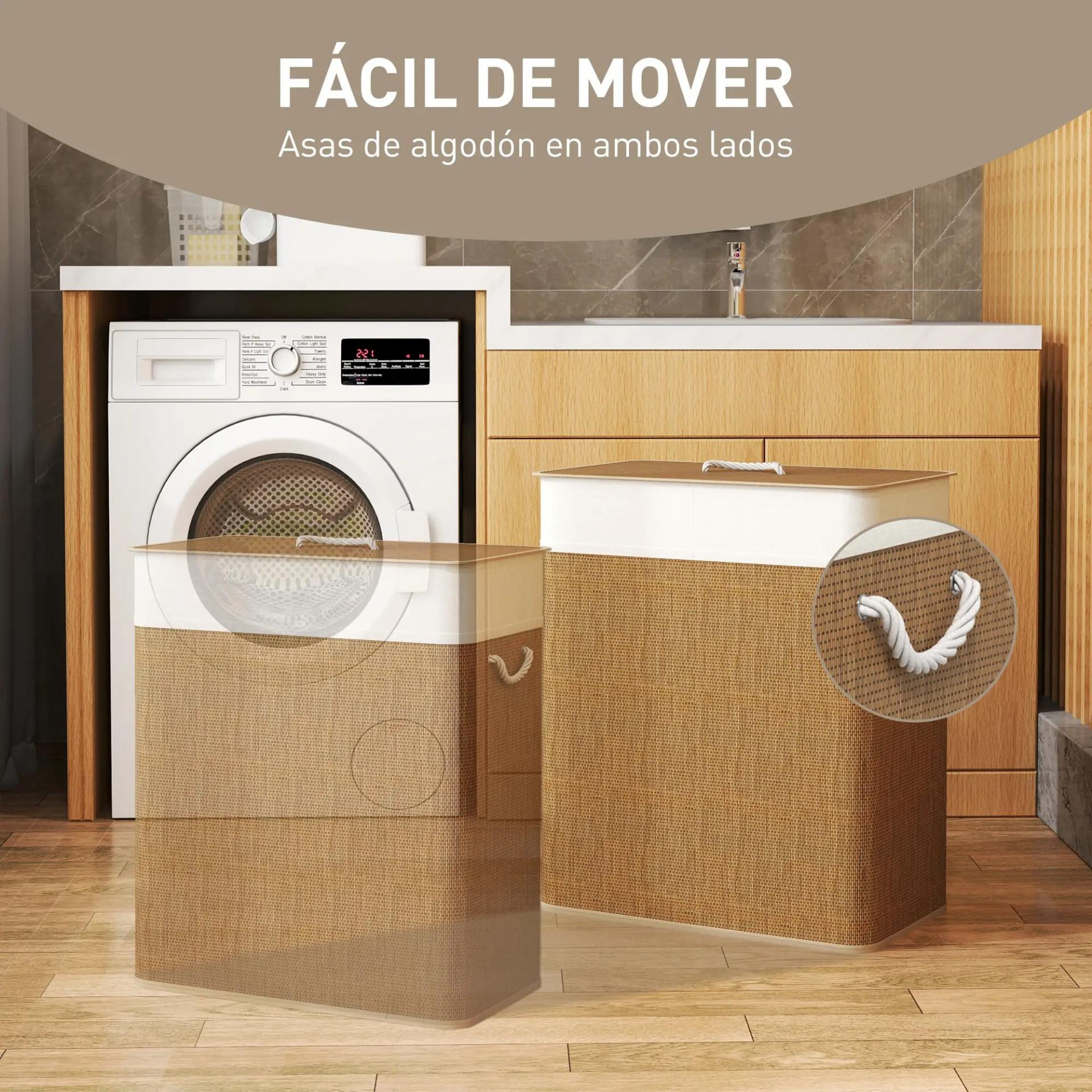 Cesto de Ropa Sucia de Bambú con 2 Compartimentos Asas para Facilitar el Uso y Bolsas Desmontables Lavables 52x32x63 cm