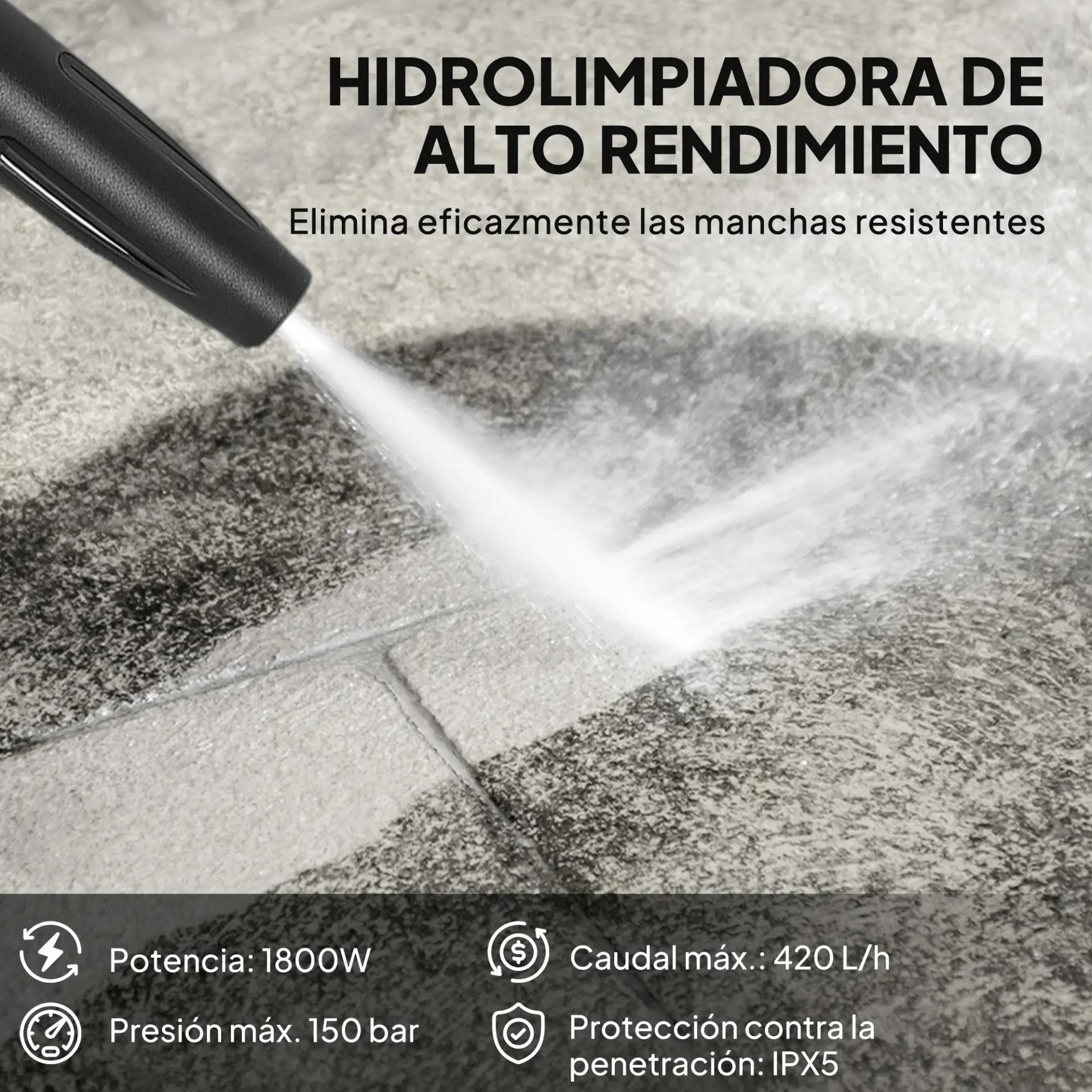 MOTOR POTENTE DE 1800 W Y 150 BAR: Esta hidrolimpiadora de Outsunny ofrece una presión máxima de 150 bar y un caudal de 420 L/h, ideal para eliminar la suciedad más difícil en coches, suelos, paredes o muebles de exterior con la máxima eficiencia