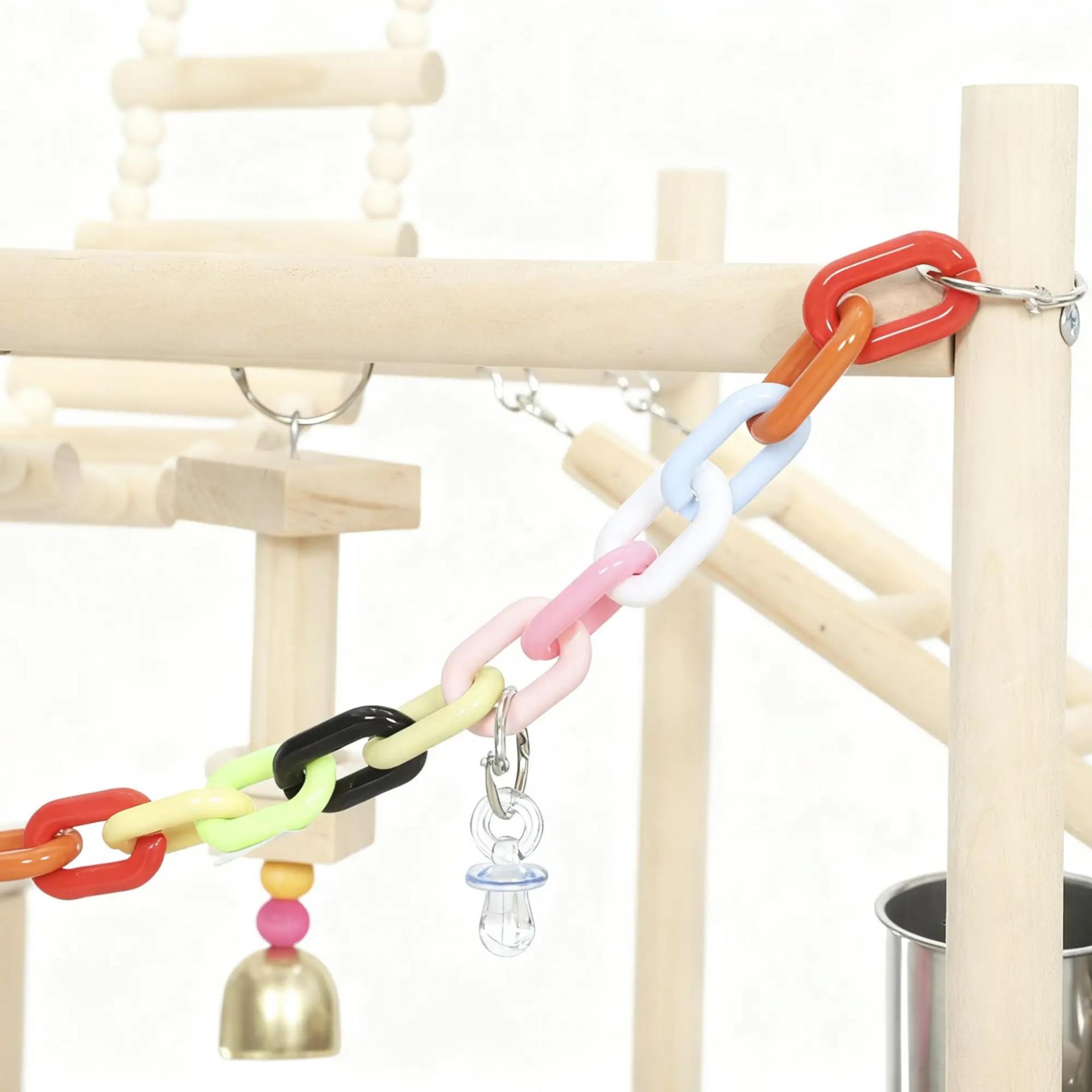 - ACCESORIOS RICOS PARA LA DIVERSIÓN: Equipado con escaleras, columpios con juguetes para picar y campanas, perchas, comederos, una cadena colgante de colores, una rueda de madera para picar y una percha mordedora, este soporte ofrece diversión y mantiene a tus aves sanas y activas