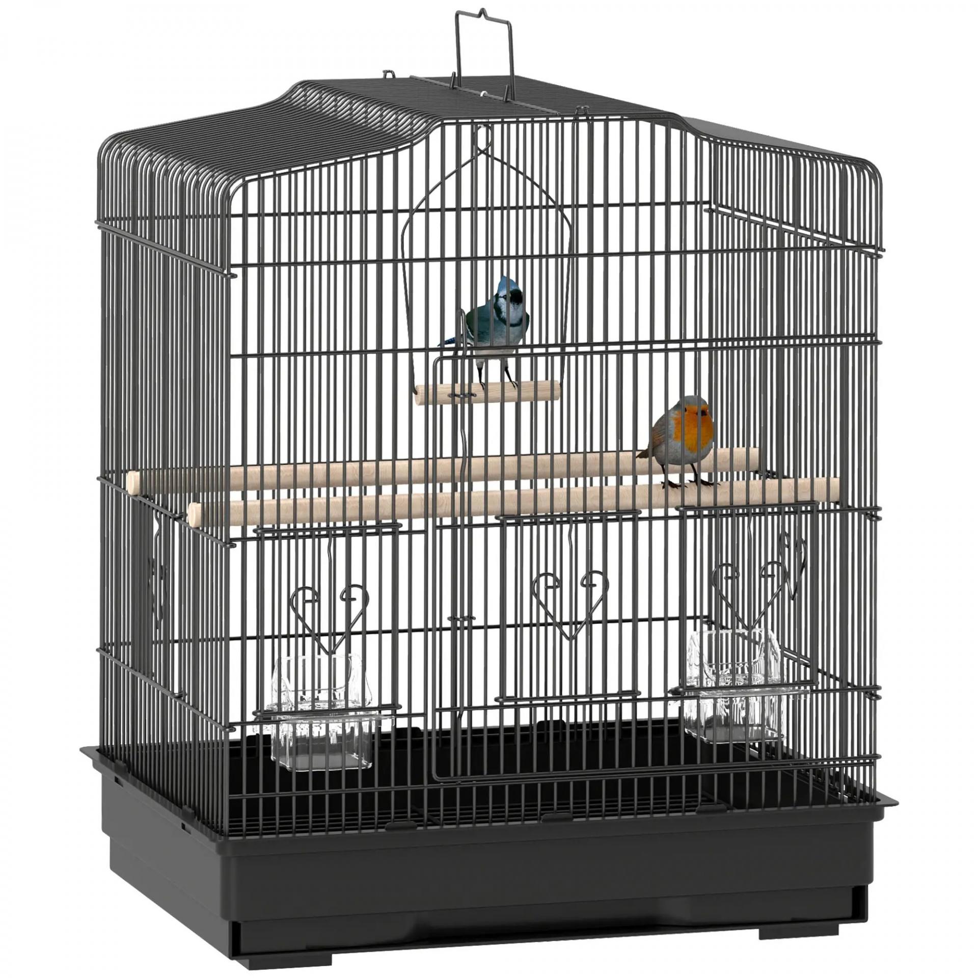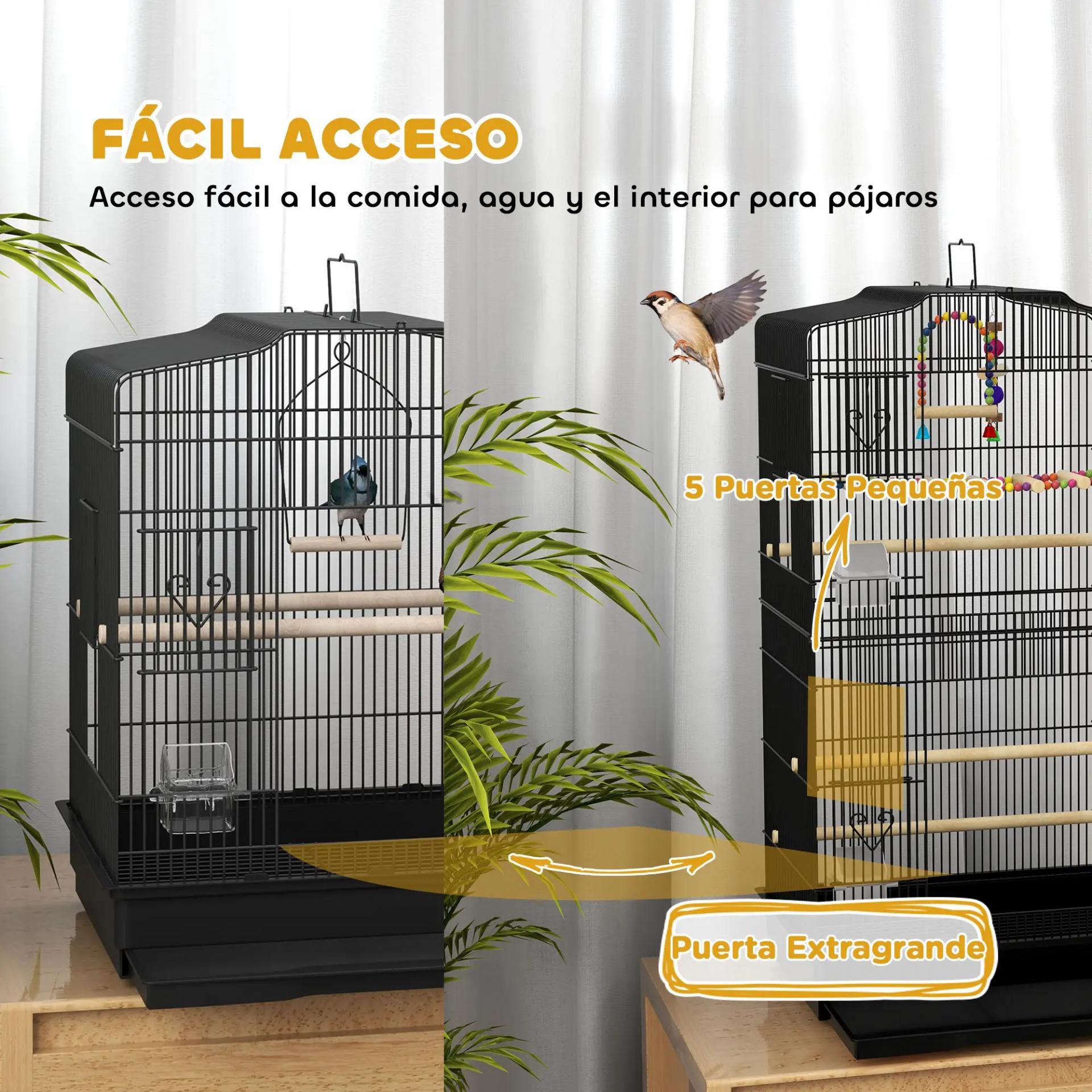 Jaula para Pájaros 46,5x36x59 cm con 2 Comederos 2 Perchas Columpio Bandeja Extraíble y Marco de Acero Negro