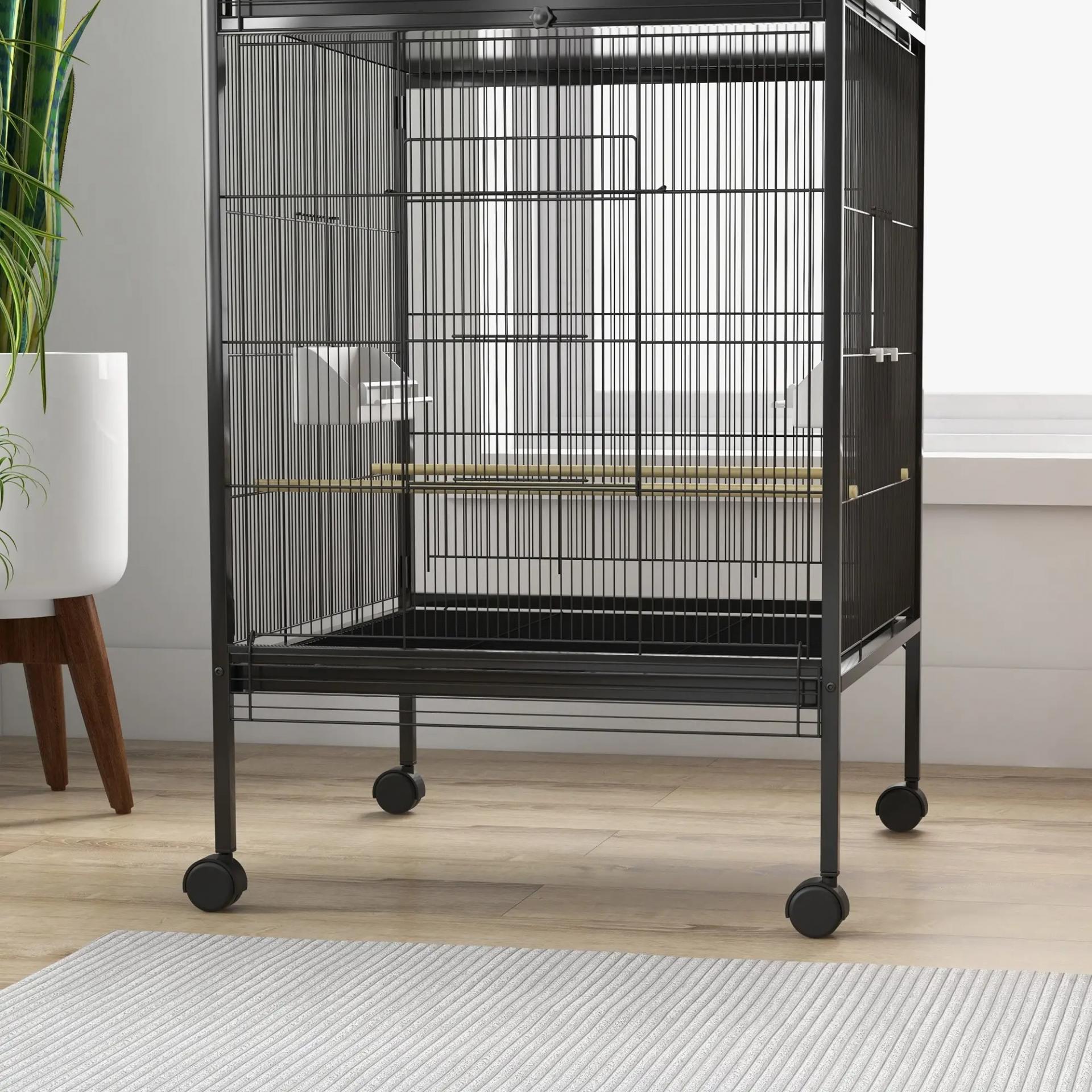 Jaula para Pájaros Grande de 2 Pisos Convertible en Sola Jaula con Ruedas Comederos 4 Perchas 78x75x168 cm Negro