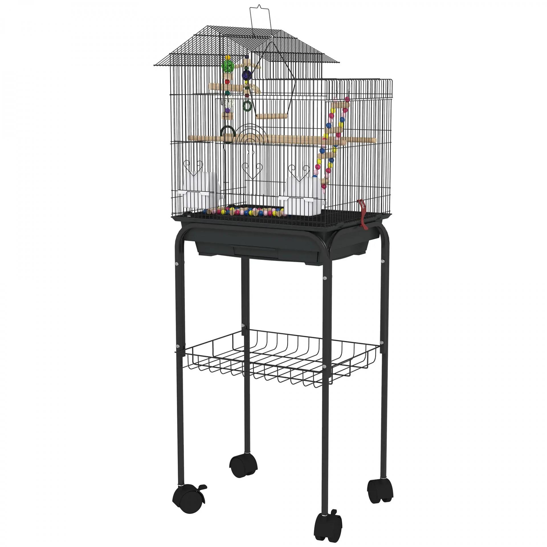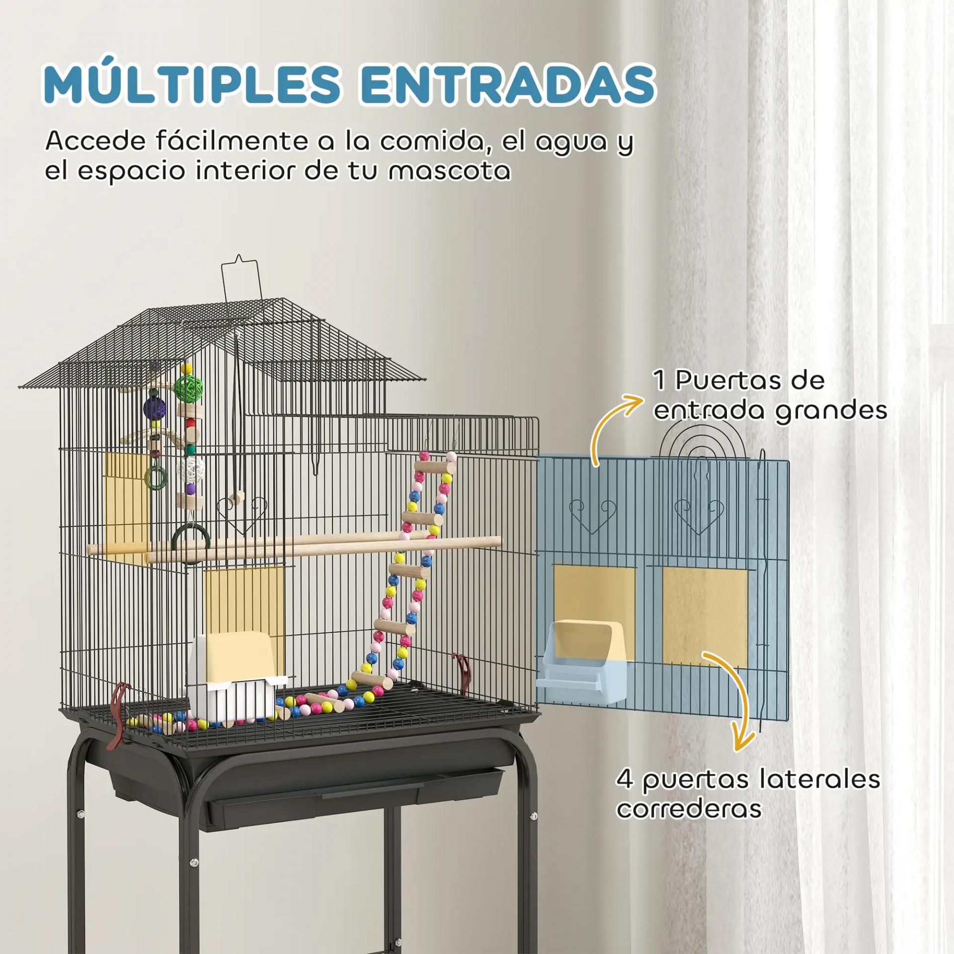 - SEGURO Y RESISTENTE: Jaula para periquitos principalmente hecha de alambre de acero con recubrimiento plástico negro para mayor resistencia a la corrosión. Incluye soporte con ruedas y un estante para tener a mano la comida de tu mascota y poder moverla