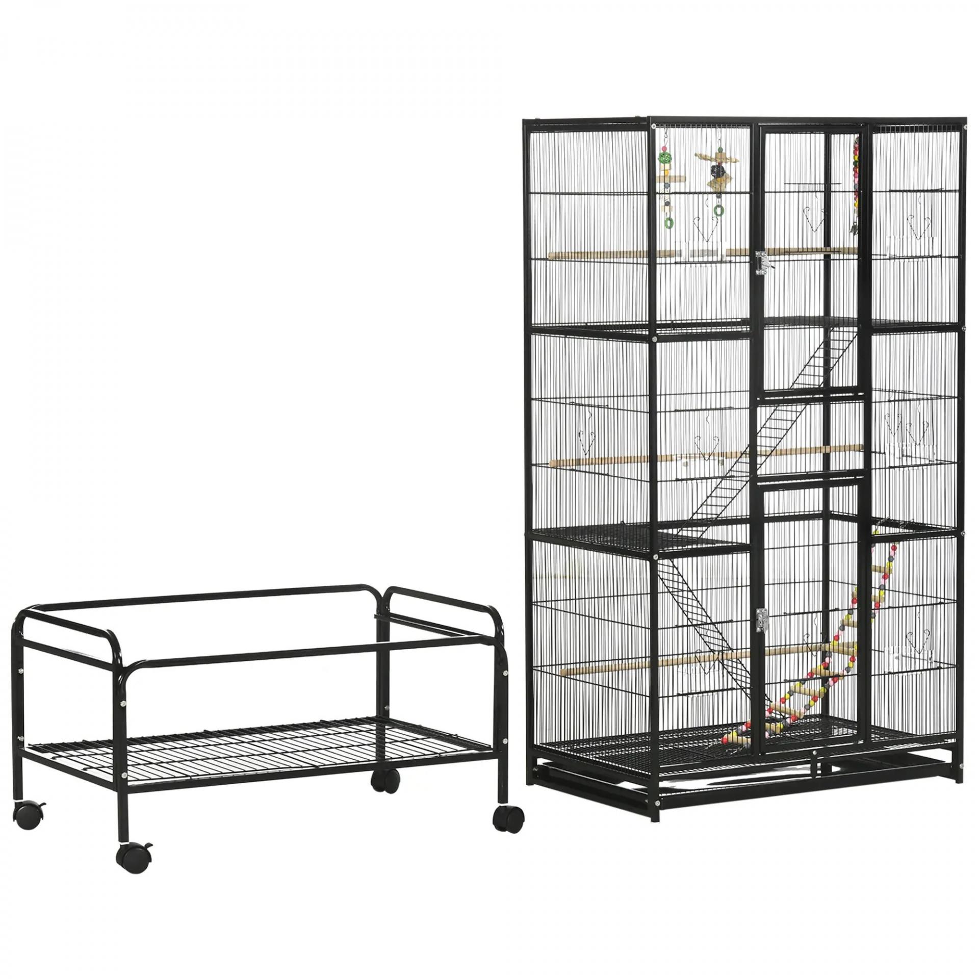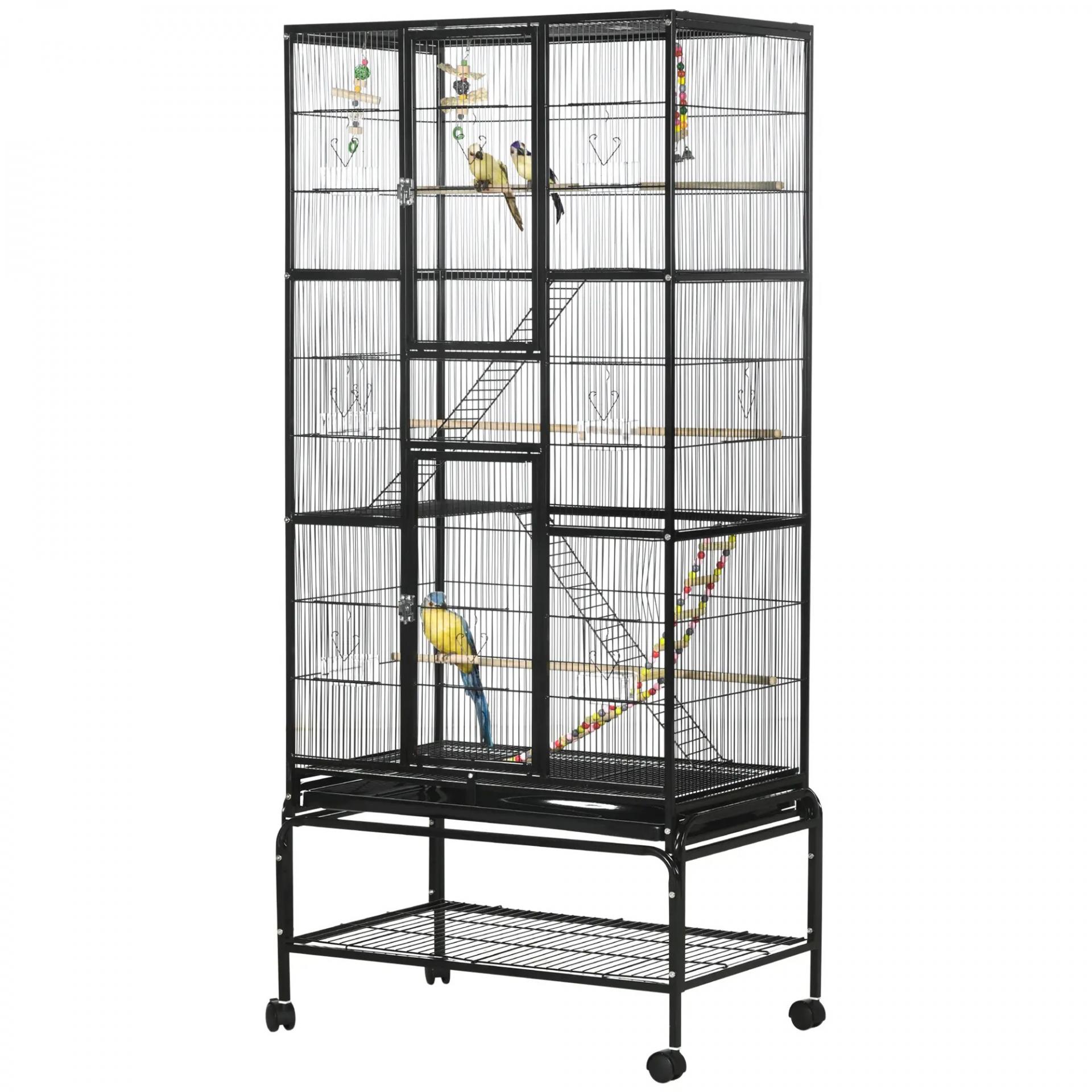 Jaula para Pájaros con Ruedas 83x53x180 cm Pajarera Metálica de 3 Niveles con 3 Perchas Comederos Juguetes Rampas Negro