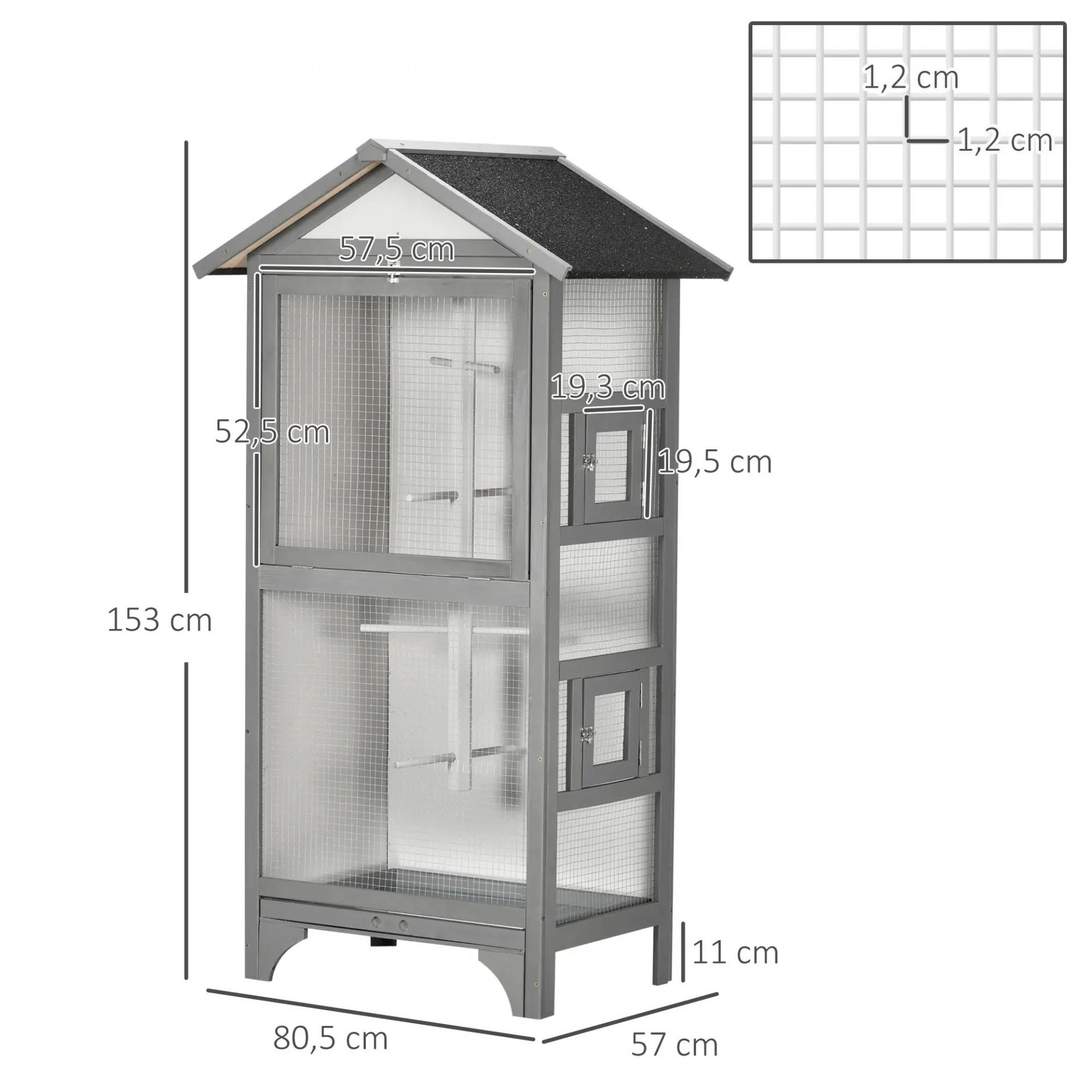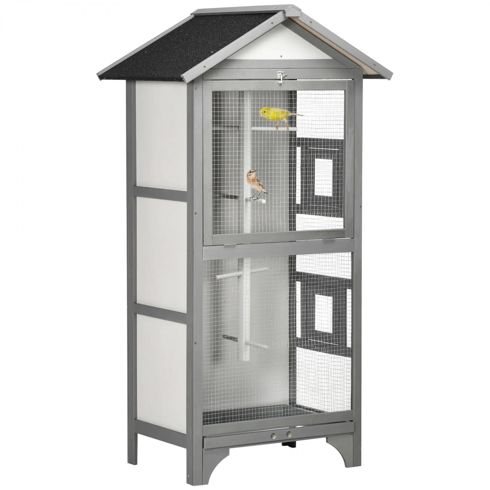 Jaula para Pájaros de Madera con 3 Puertas 4 Perchas Bandeja Extraíble y Techo Asfáltico 80,5x57x153 cm Gris Claro