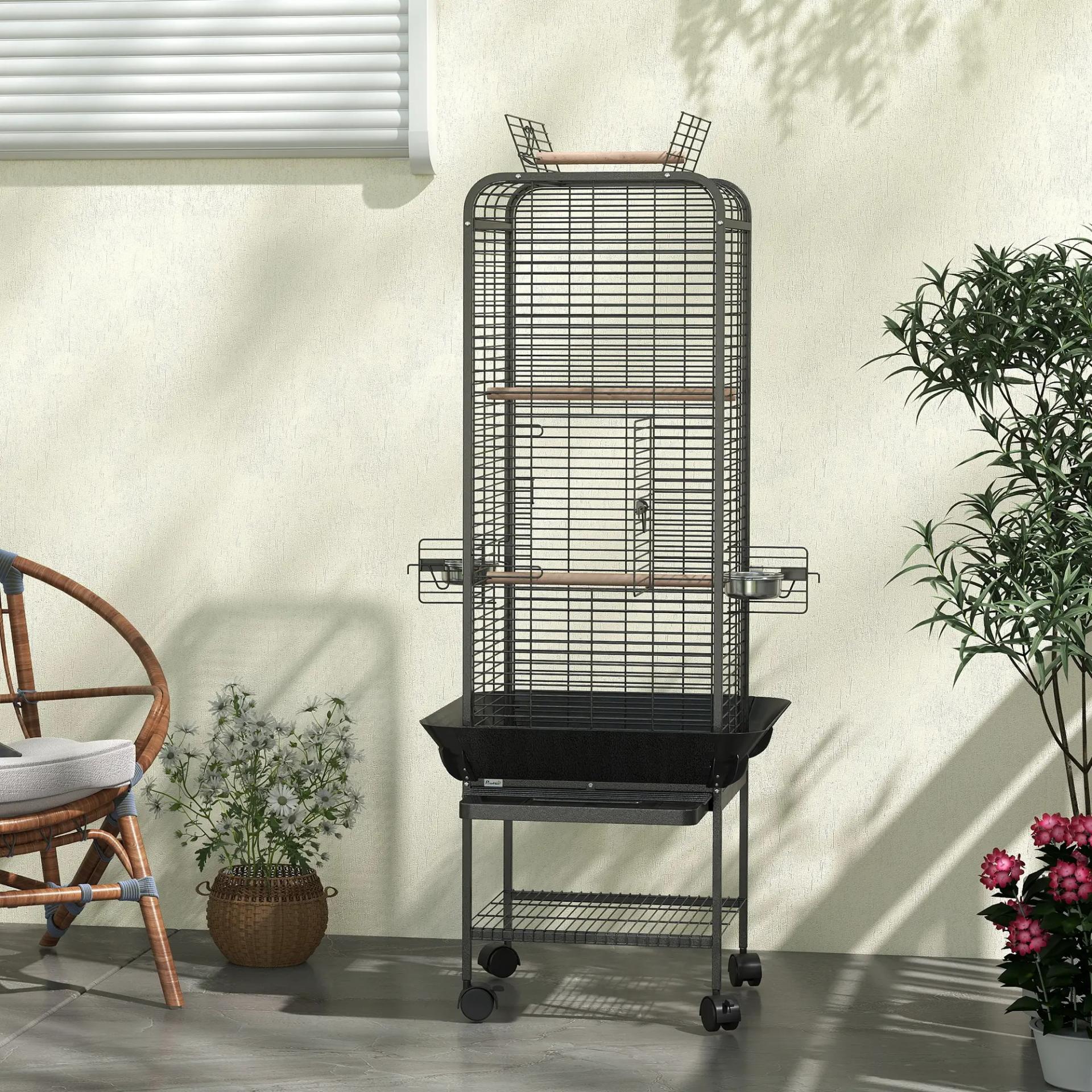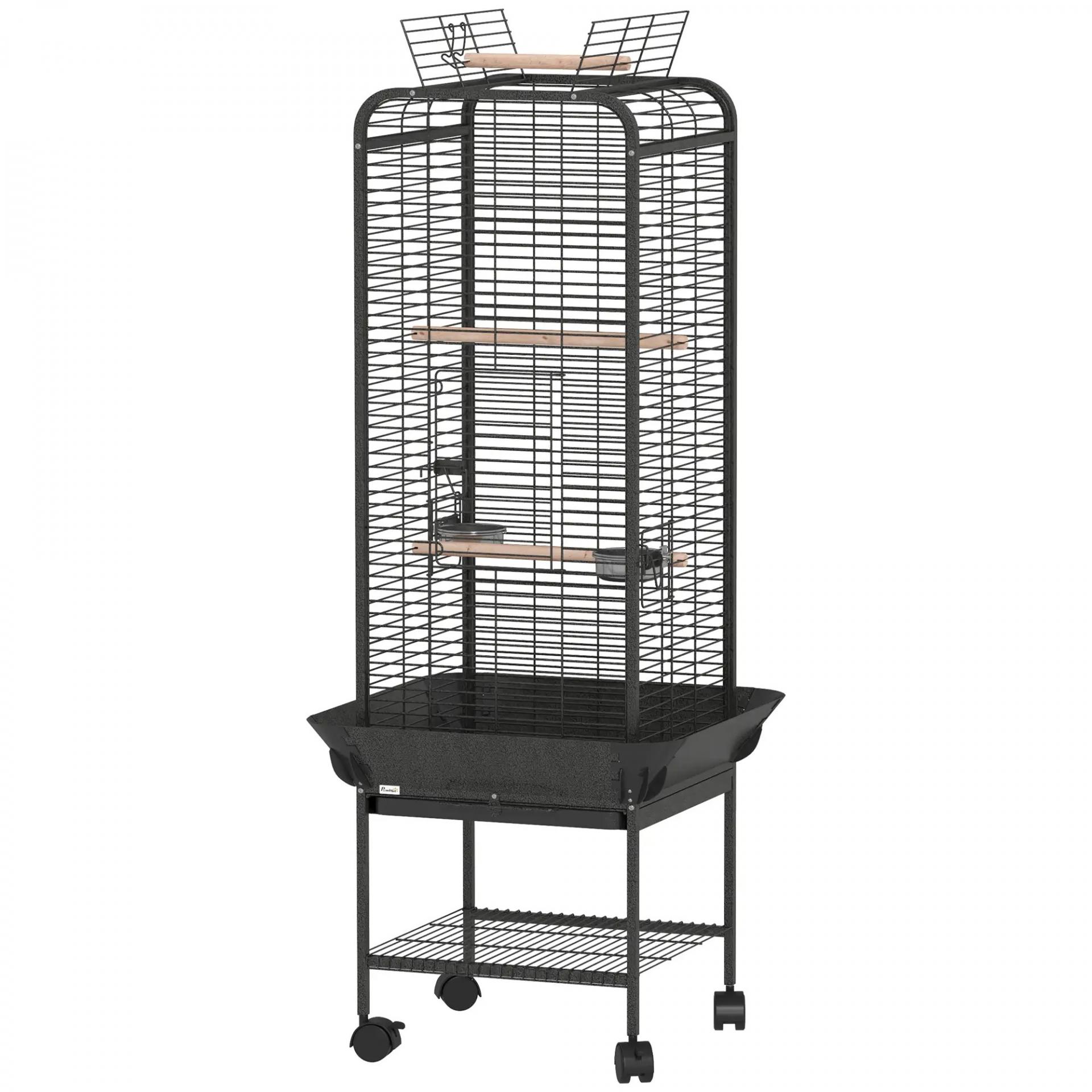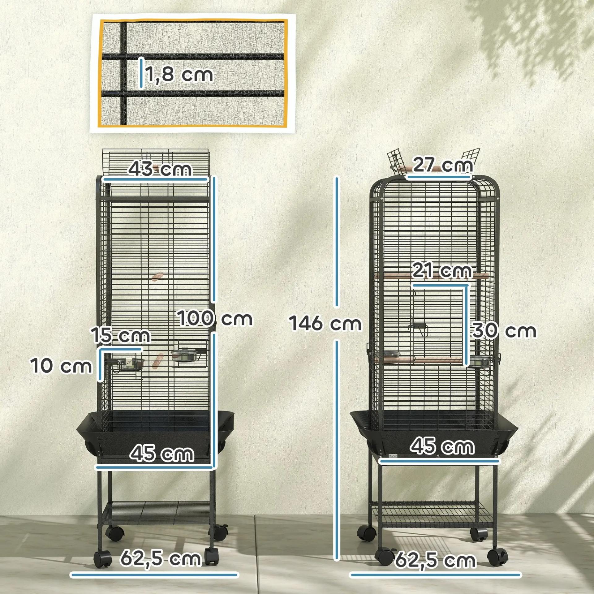 Jaula para Loros con Ruedas Perchas Comederos Estante y Bandeja Extraíble 62,5x62,5x146 cm Gris Oscuro