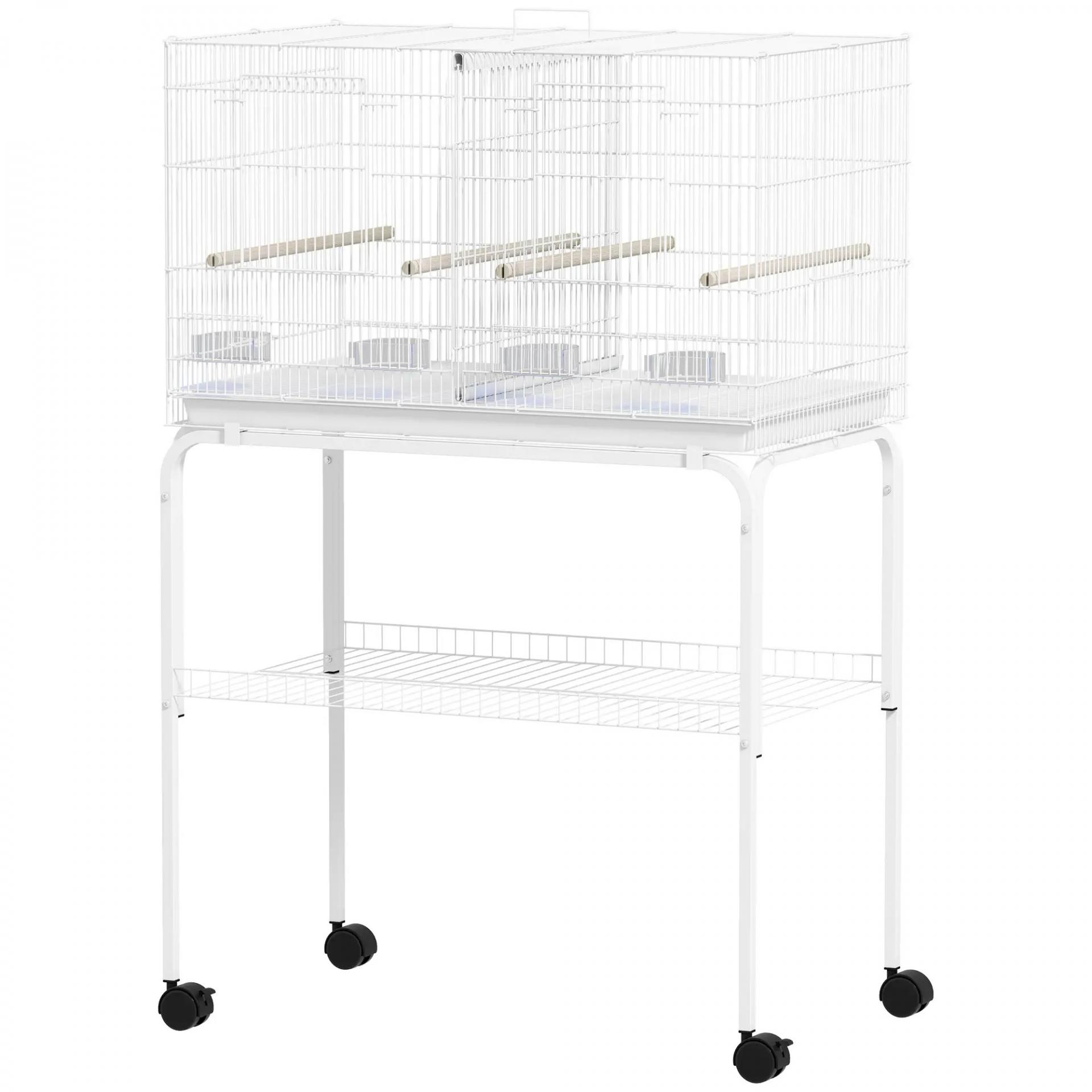 Jaula para Pájaros con Divisor Comederos Bandeja Extraíble y Soporte para Canarios y Periquitos 76x46x46/116 cm Blanco