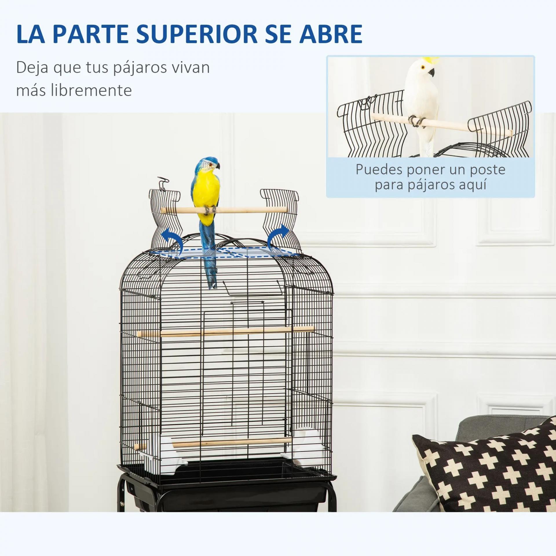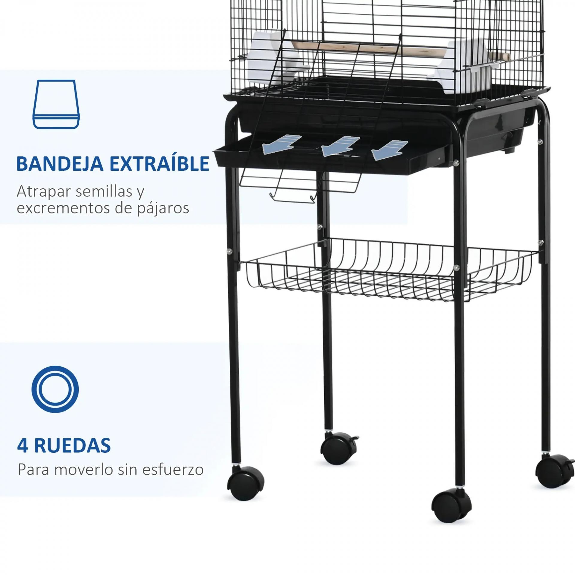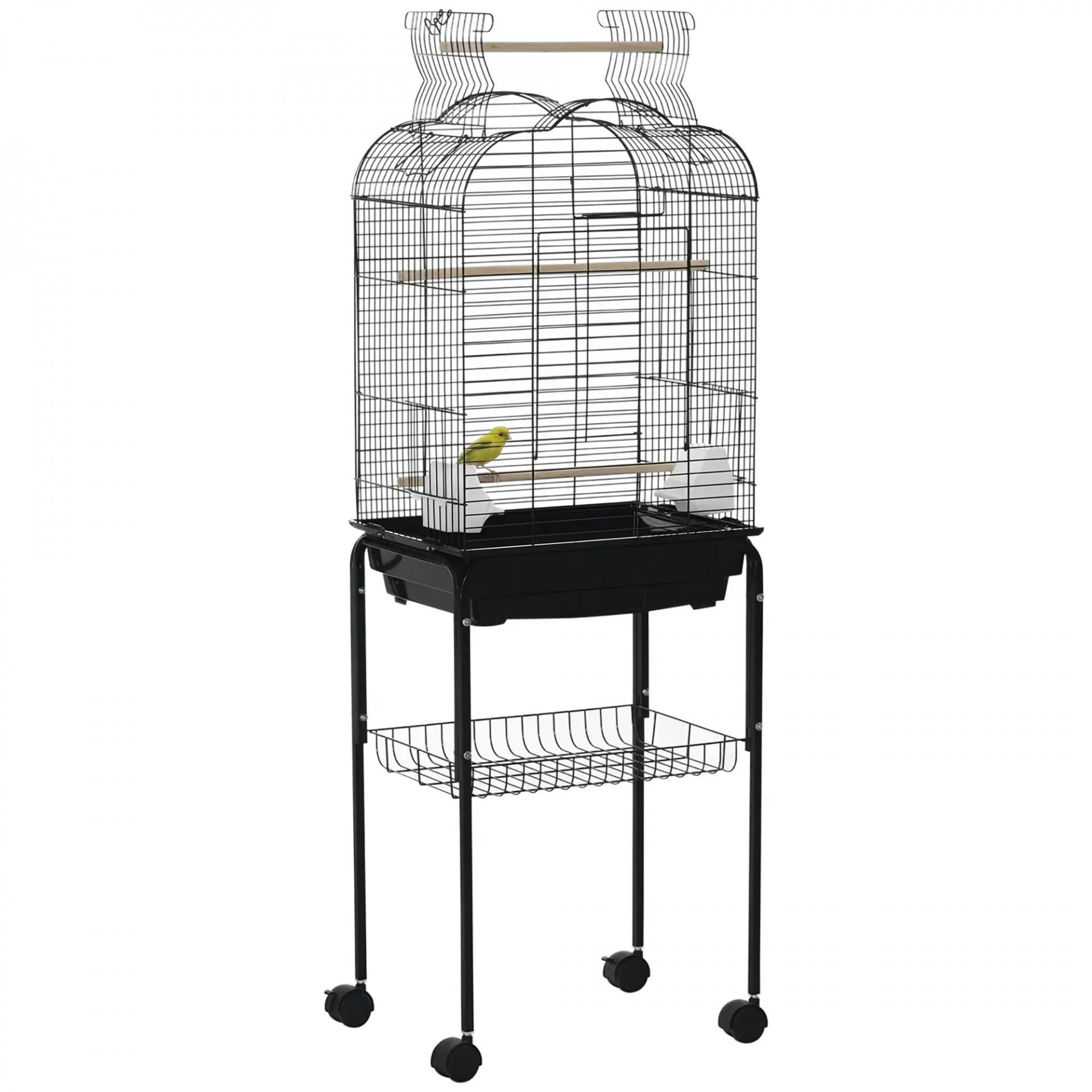 Jaula para Pájaros con Soporte Jaula de Aves Canarios con 4 Ruedas Techo Abrible 2 Comederos 3 Perchas Bandeja Extraíble y Estante Inferior 46x36x130 cm Negro