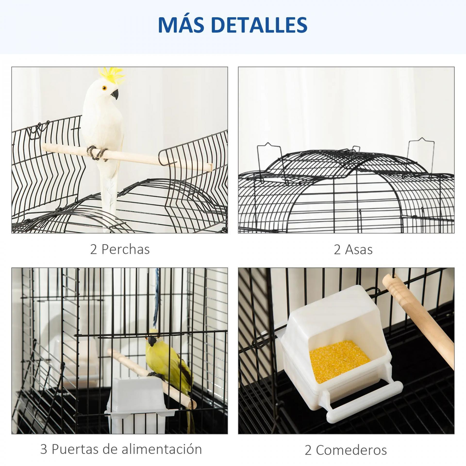 - MÚLTIPLES PUERTAS Y POSTE EXTERNO: Cuenta con puertas delanteras grandes y dos puertas más pequeñas que dan acceso directo a los 2 comederos incluidos. La parte superior se puede abrir para colocar un poste para pájaros, ofreciéndoles un espacio donde postrarse cuando les abras la jaula y estén en libertad