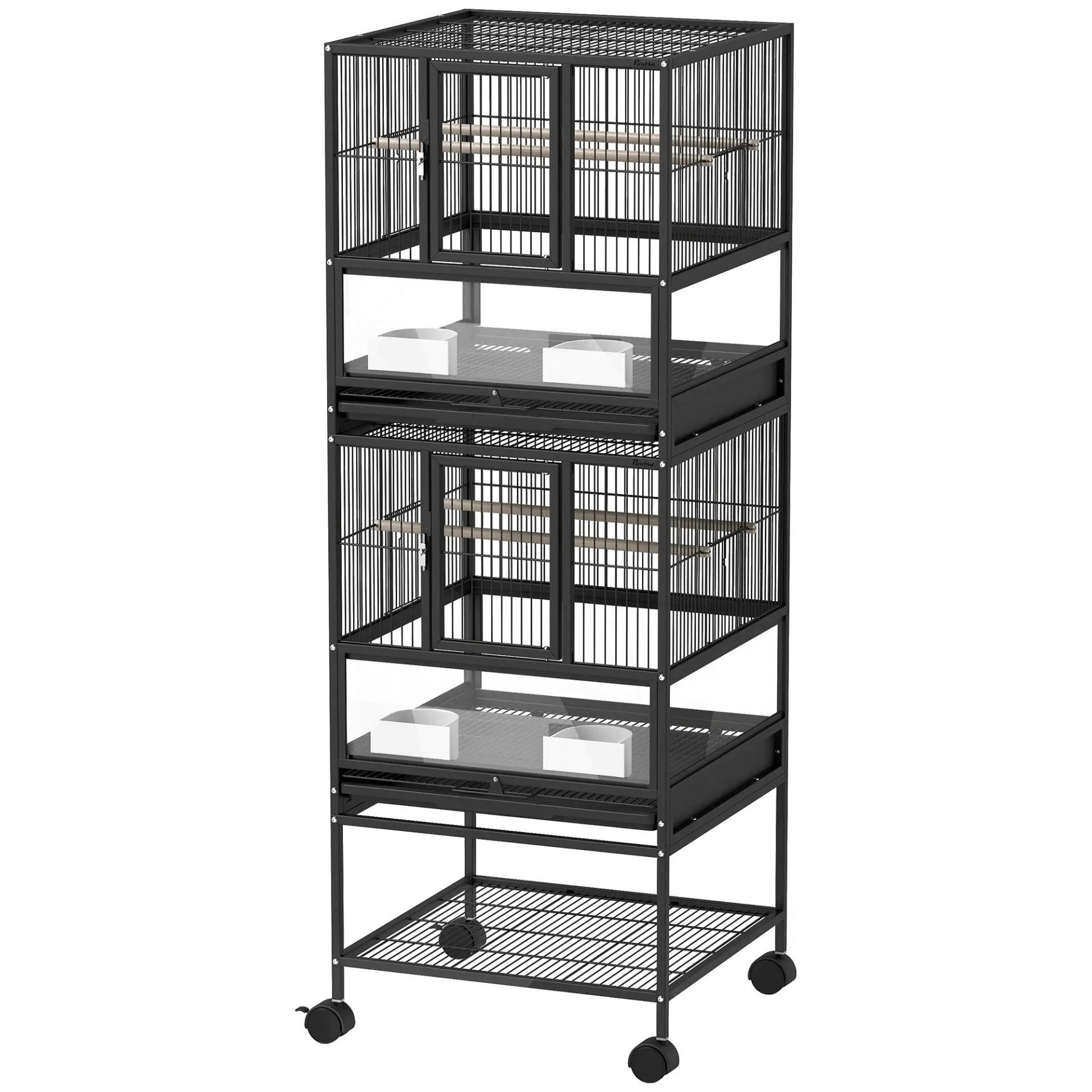 Jaula para Pájaros de 2 Niveles con Paneles Acrílicos Comederos Perchas Ruedas y Estante Inferior 48x46x134,5 cm Negro