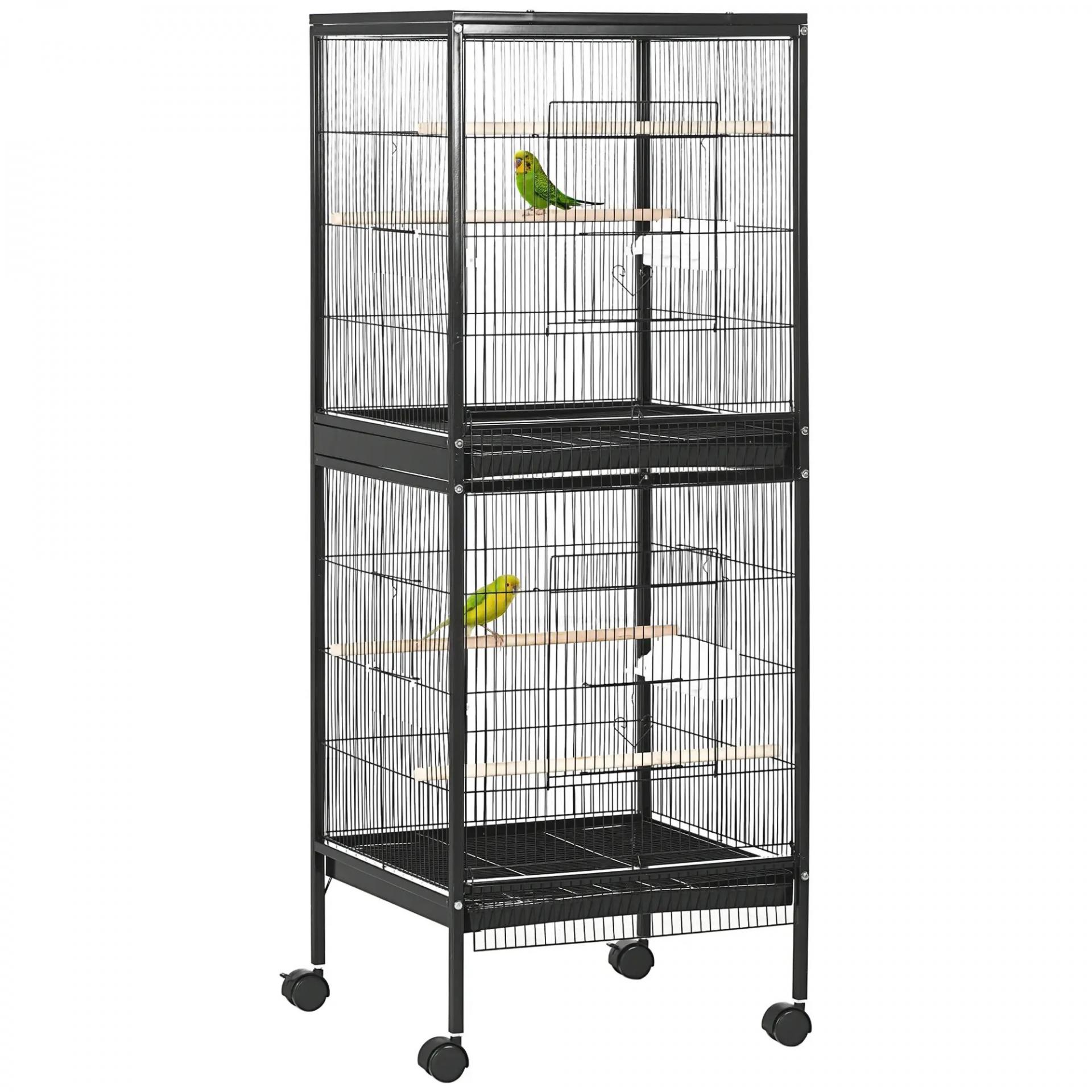 Jaula para Pájaros de 2 Niveles con Ruedas Bandejas Extraíbles Puertas Comederos Perchas 51,5x50x140 cm Negro