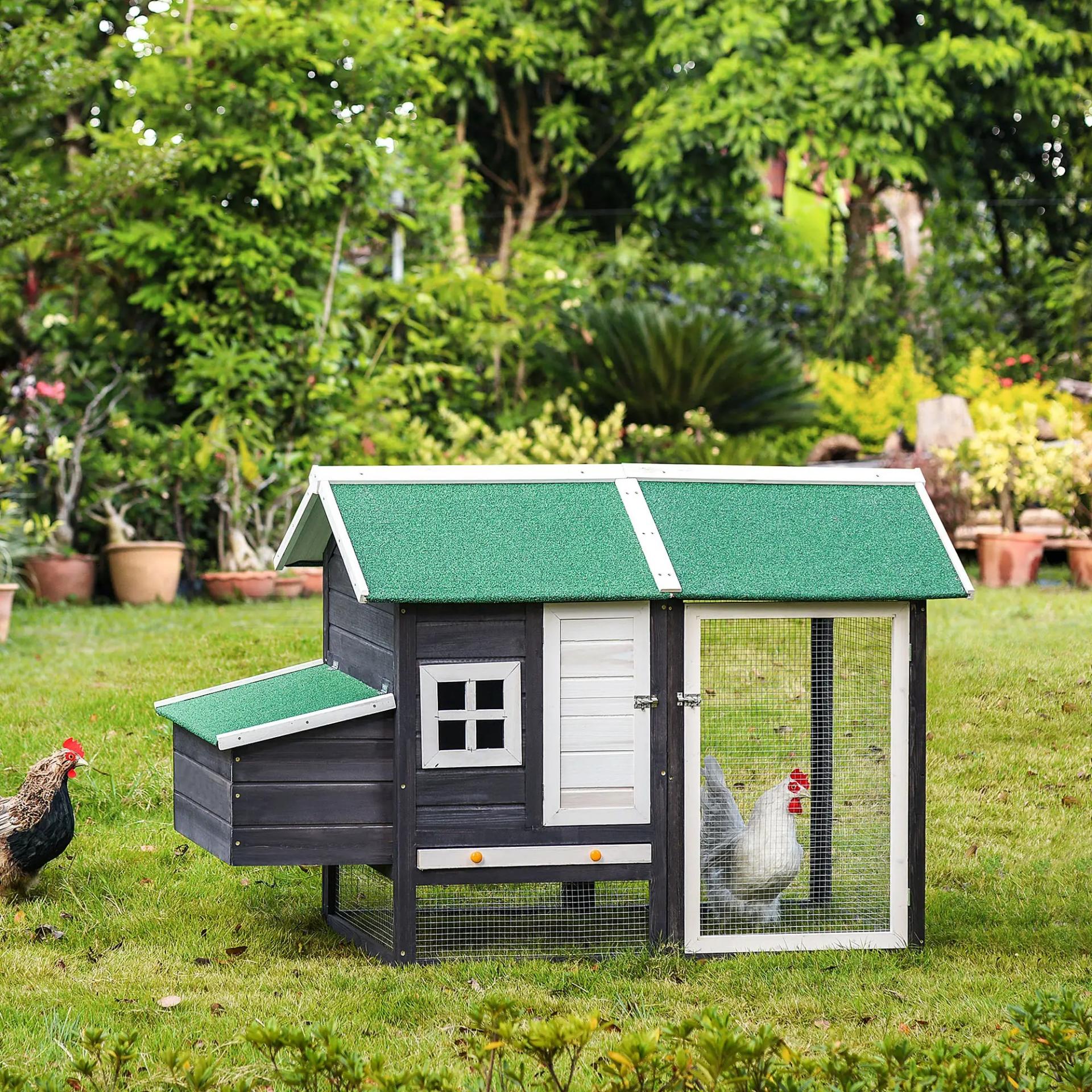 GALLINERO DE MADERA RESISTENTE: Gallinero de madera y alambre de metal compuesto por una amplia zona abierta y una caseta con un nido lateral. Con techo asfáltico para mayor resistencia a la intemperie