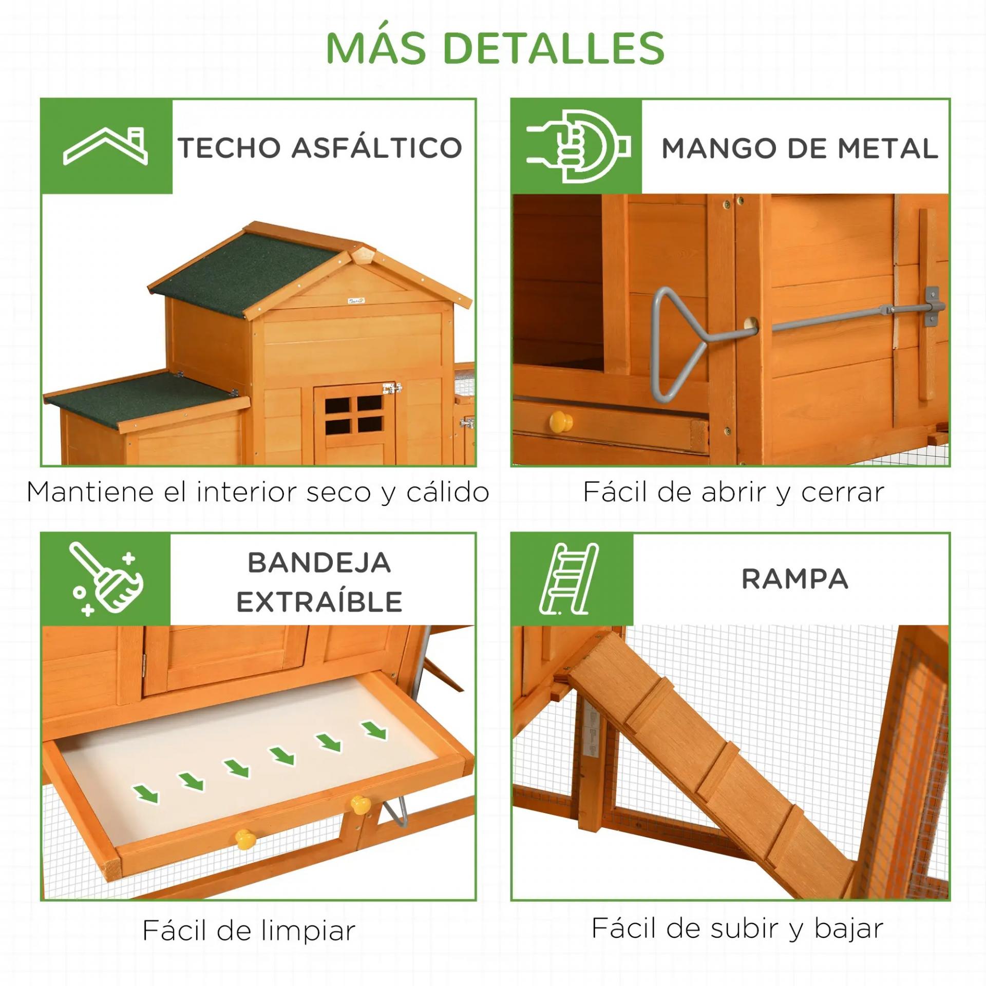 - BANDEJA Y RAMPA EXTRAÍBLES: Este gallinero para exterior grande tiene una bandeja extraíble para facilitar la limpieza de la casa. Además, cuenta con una rampa para facilitar el acceso de tus gallinas a la casa principal