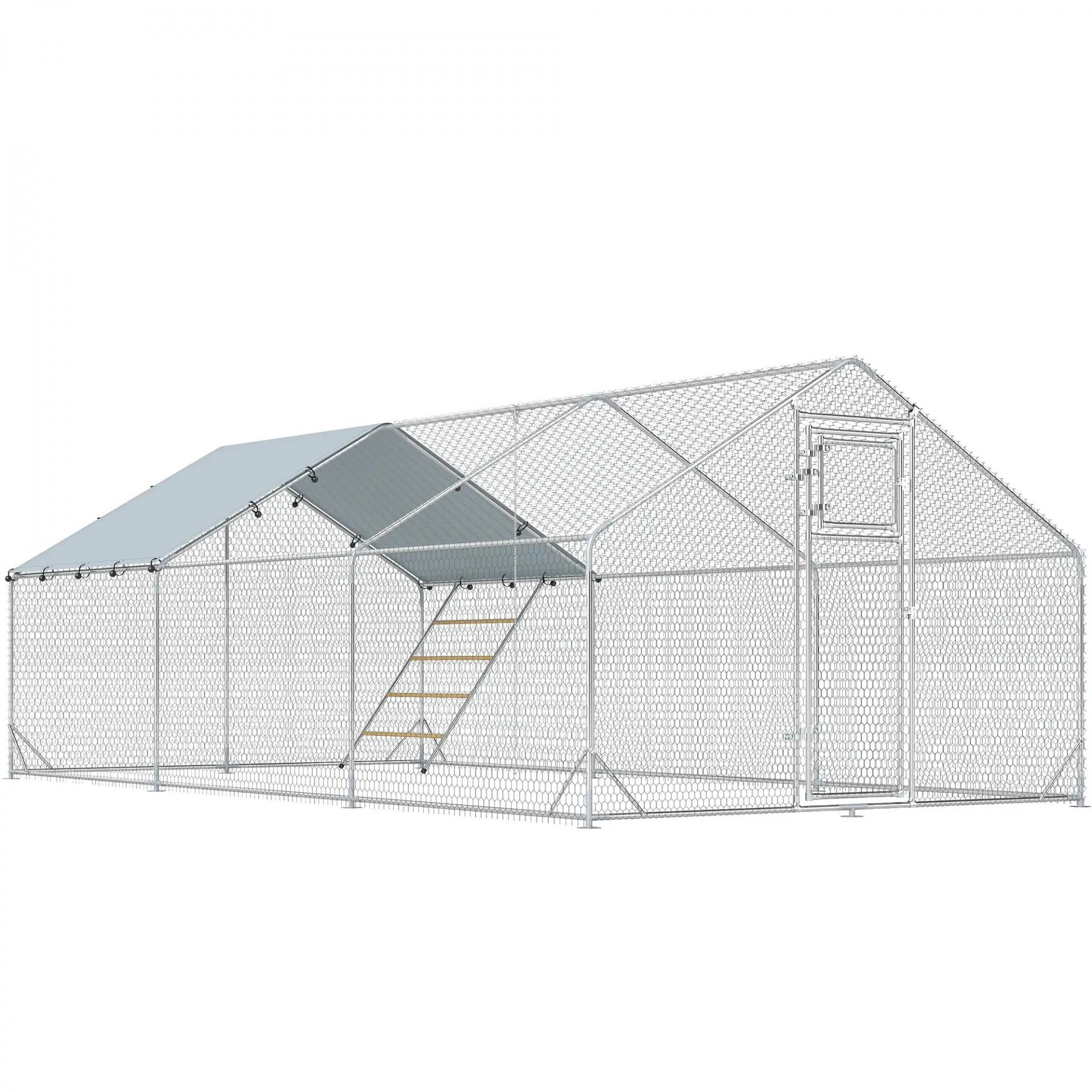 Gallinero Metálico de Exterior de 3x6m con Percha Multiusos Comedero Colgante Tipo Brocheta y Lona Protectora Resistente