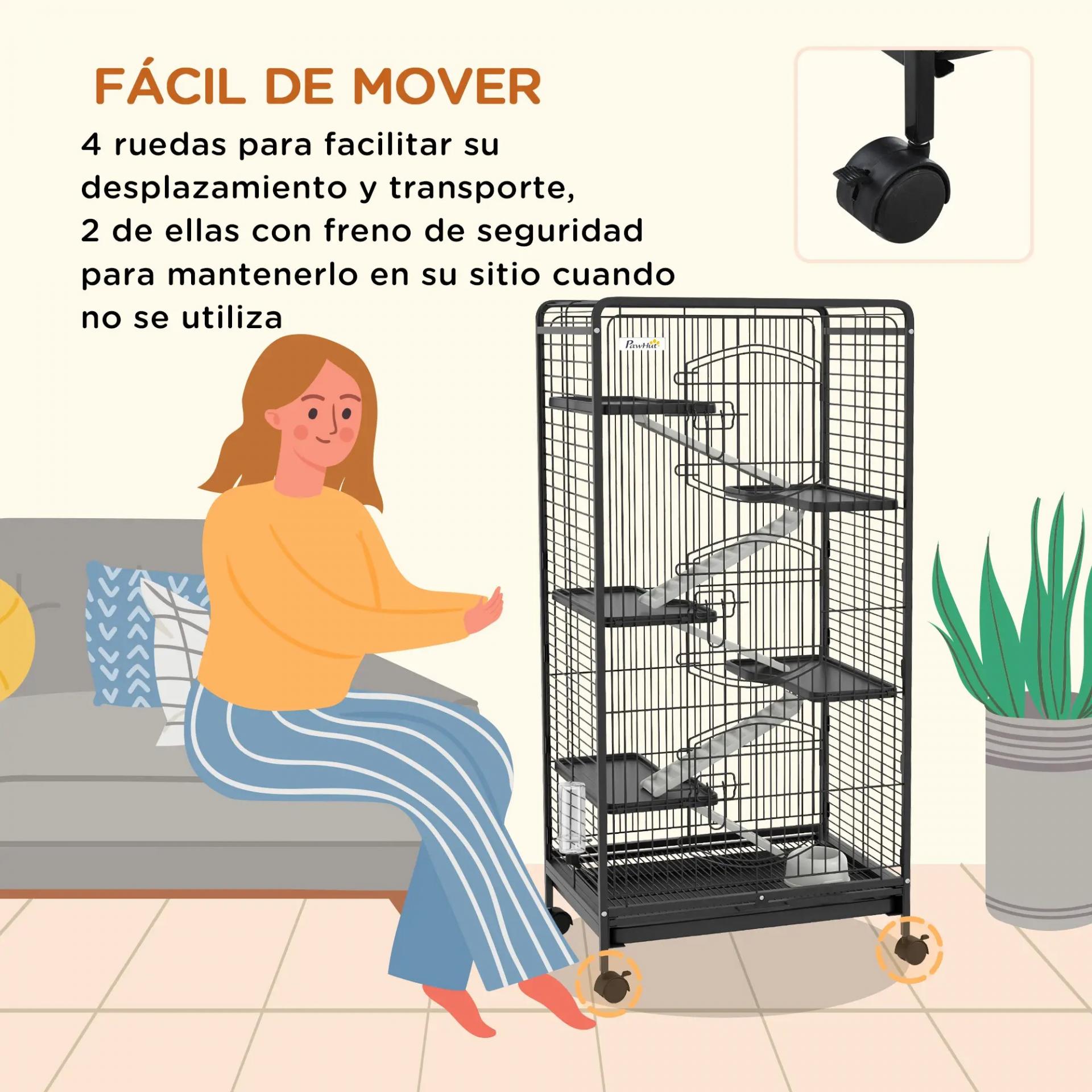 Jaula para Roedores de 6 Niveles con Ruedas Plataformas Bandeja Extraíble Comedero y Bebedero 61,5x44x131 cm Negro