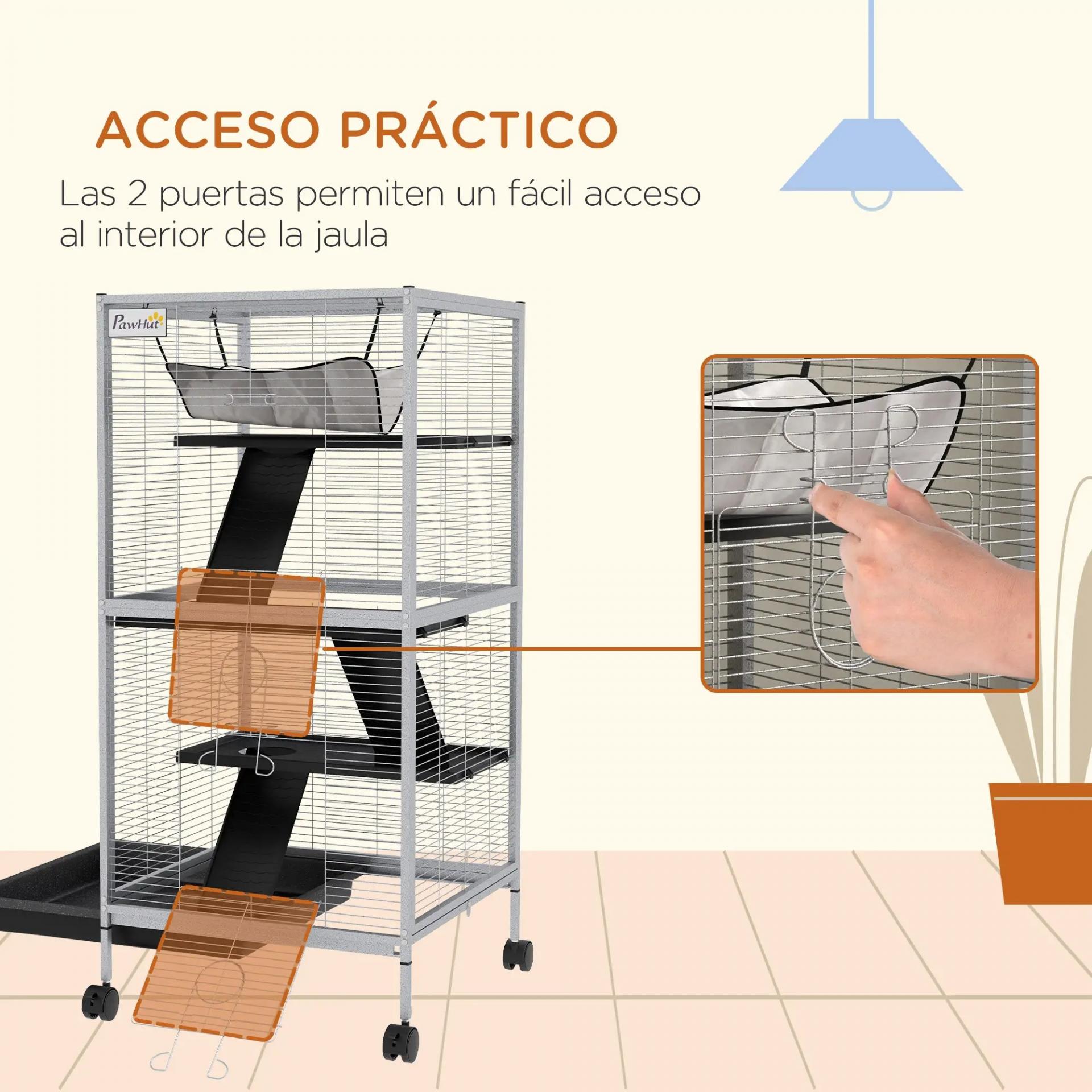 Jaula para Animales Pequeños con Ruedas 2 Puertas 3 Rampas Hamaca Colgante y Bandeja Extraíble 52x52x113,5cm Gris