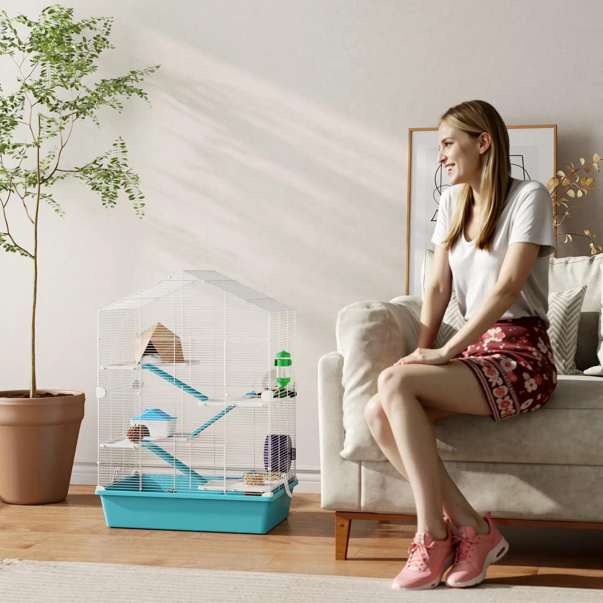 Jaula para Hámster de 5 Niveles con Plataformas Cuenco Bebedero Casita Rampas y Rueda de Ejercicio 58x36x81cm Azul Claro