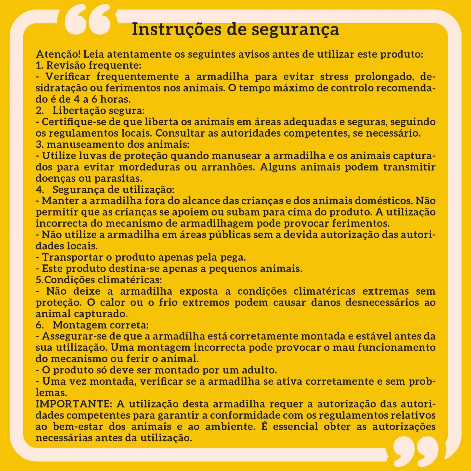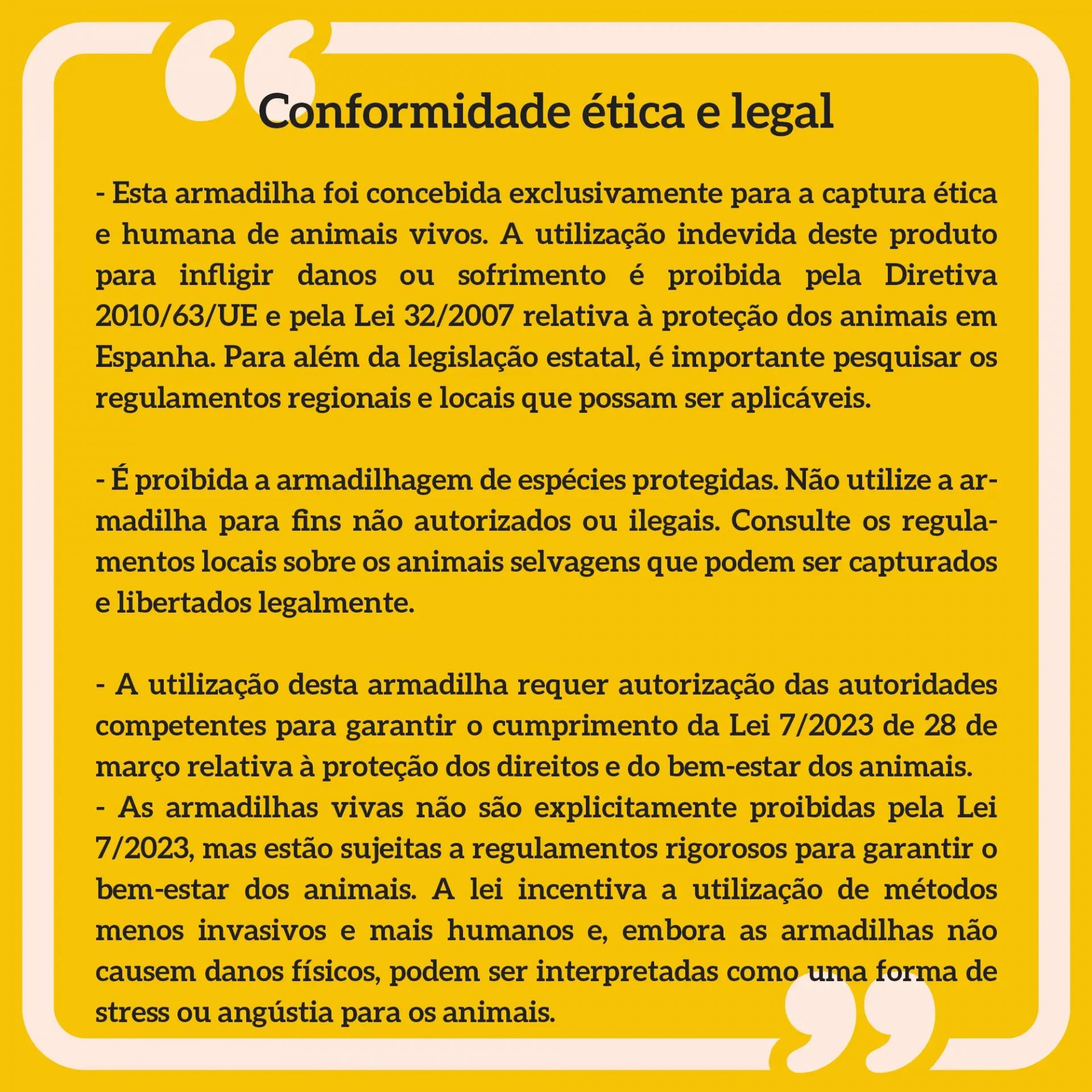 - IMPORTANTE: El uso de esta trampa requiere autorización de las autoridades competentes para asegurar el cumplimiento de las normativas de bienestar animal y medioambientales. Es fundamental obtener los permisos necesarios antes de utilizarla