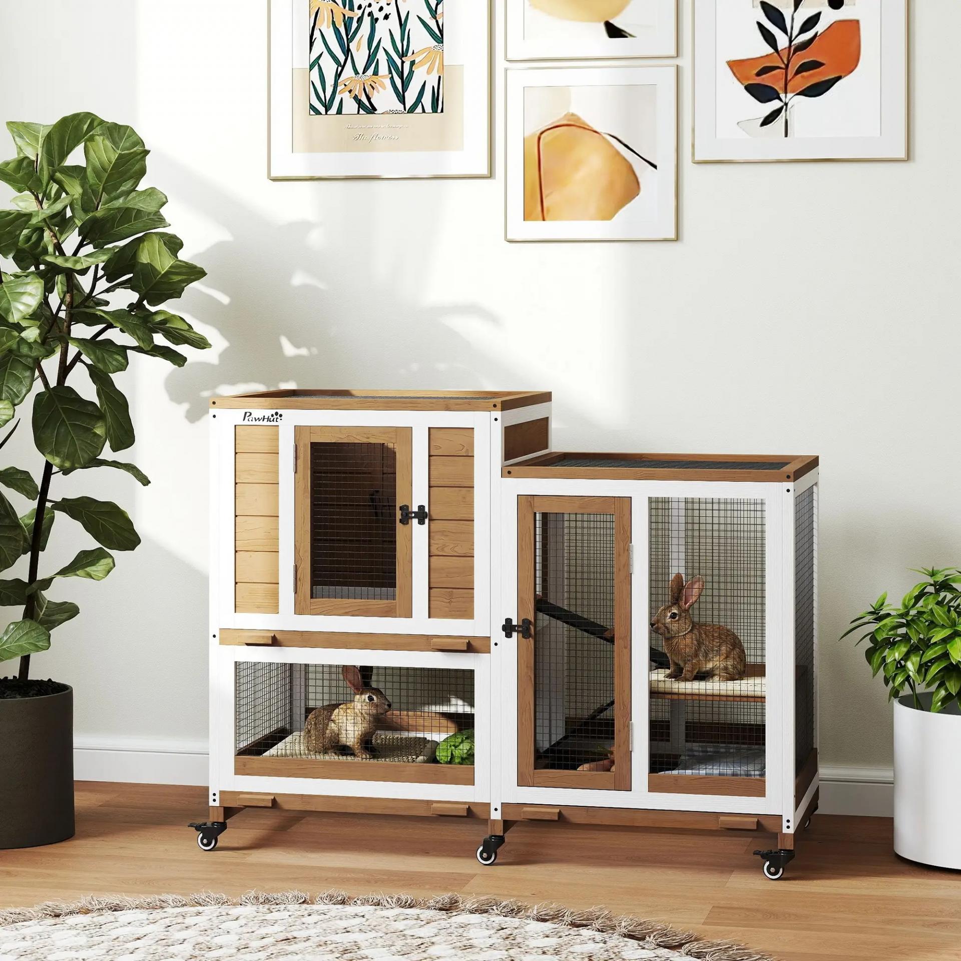 - ESTRUCTURA RESISTENTE: Fabricada en madera de abeto y revestida con un acabado protector, esta conejera interior es resistente e ideal para un uso prolongado. Es perfecta para proporcionar un hogar seguro y cómodo para tu mascota
