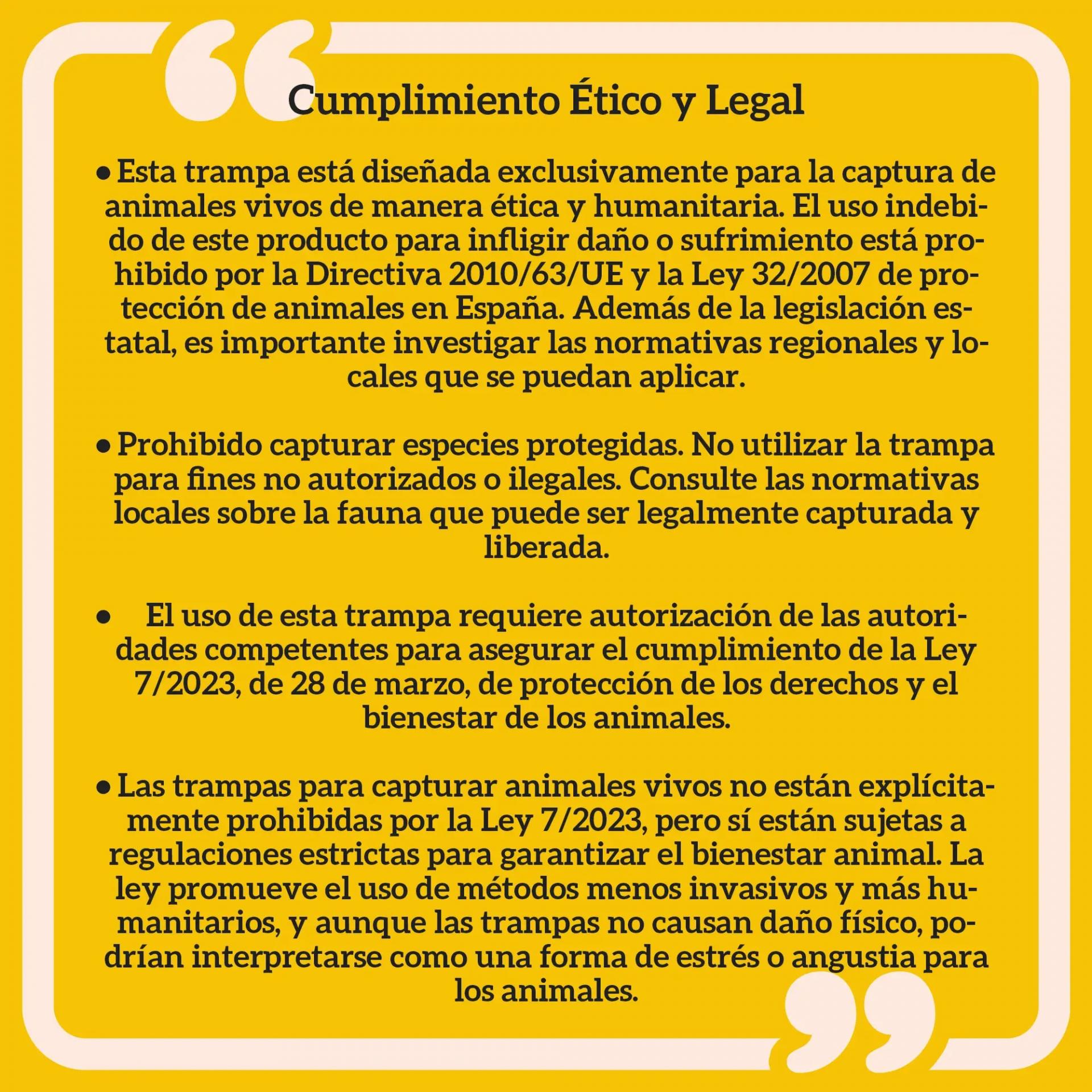 MEDIDAS TOTALES: 100x24x30 cm (LxANxAL). IMPORTANTE: Antes de usar esta trampa, asegúrate de contar con la autorización de las autoridades competentes para cumplir con las normativas de bienestar animal y medioambiente