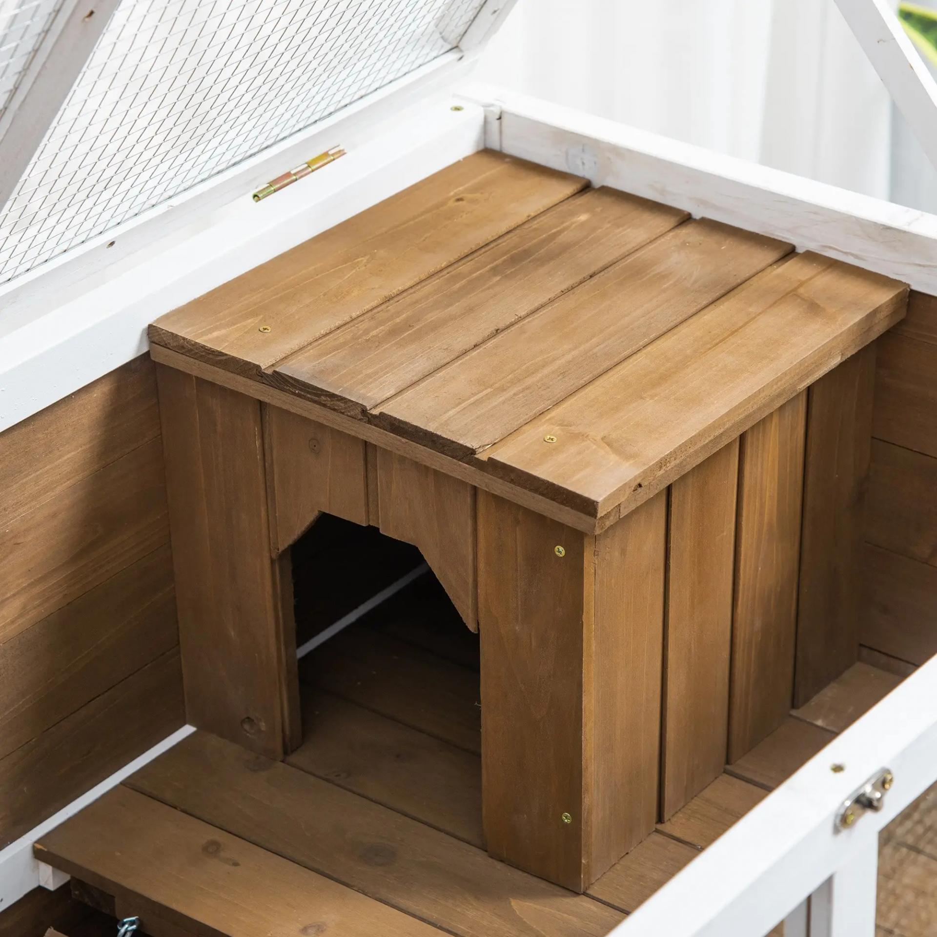 ESTRUCTURA RESISTENTE Y SEGURA: Esta conejera de jardín está hecha de madera de abeto, plástico, metacrilato y alambre de metal, todos materiales inocuos para tus mascotas, libres de toxinas y respetuosos con el medio ambiente