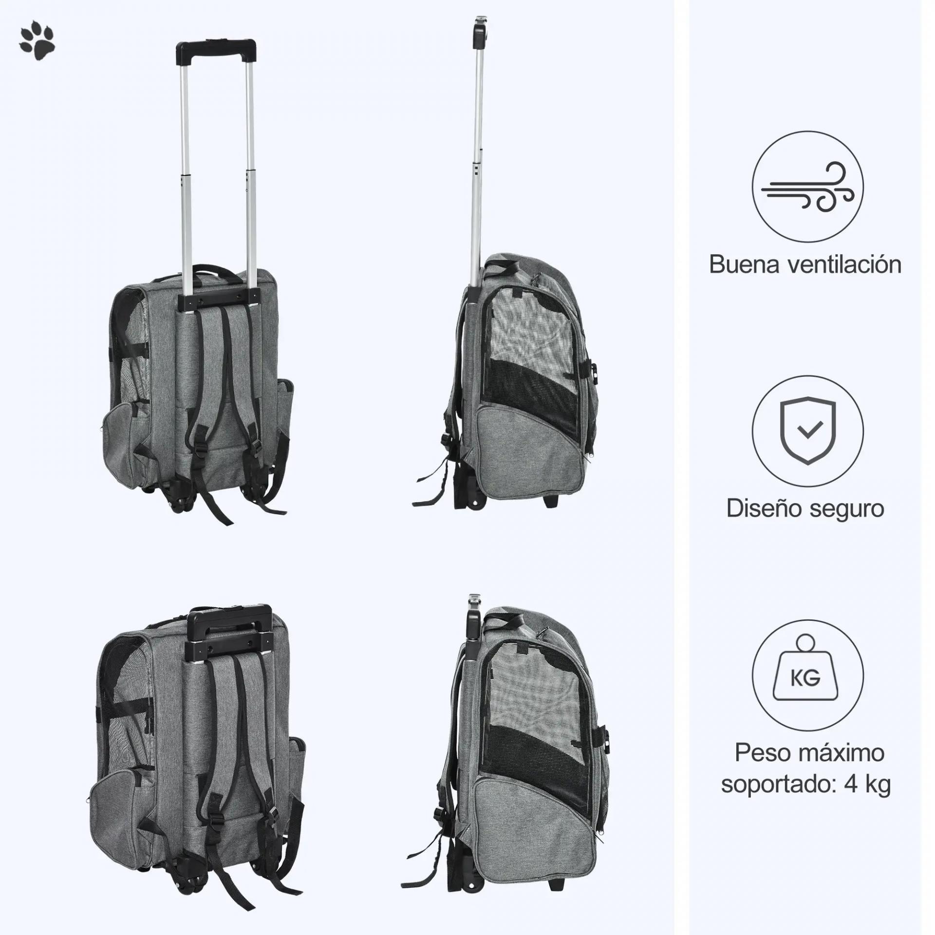 Transportín Carrito para Mascotas 2 en 1 Mochila de Viaje con 2 Ruedas para Perros Gatos con Asa Retráctil de Aluminio y Bolsillos de Almacenaje 42x25x55 cm Gris