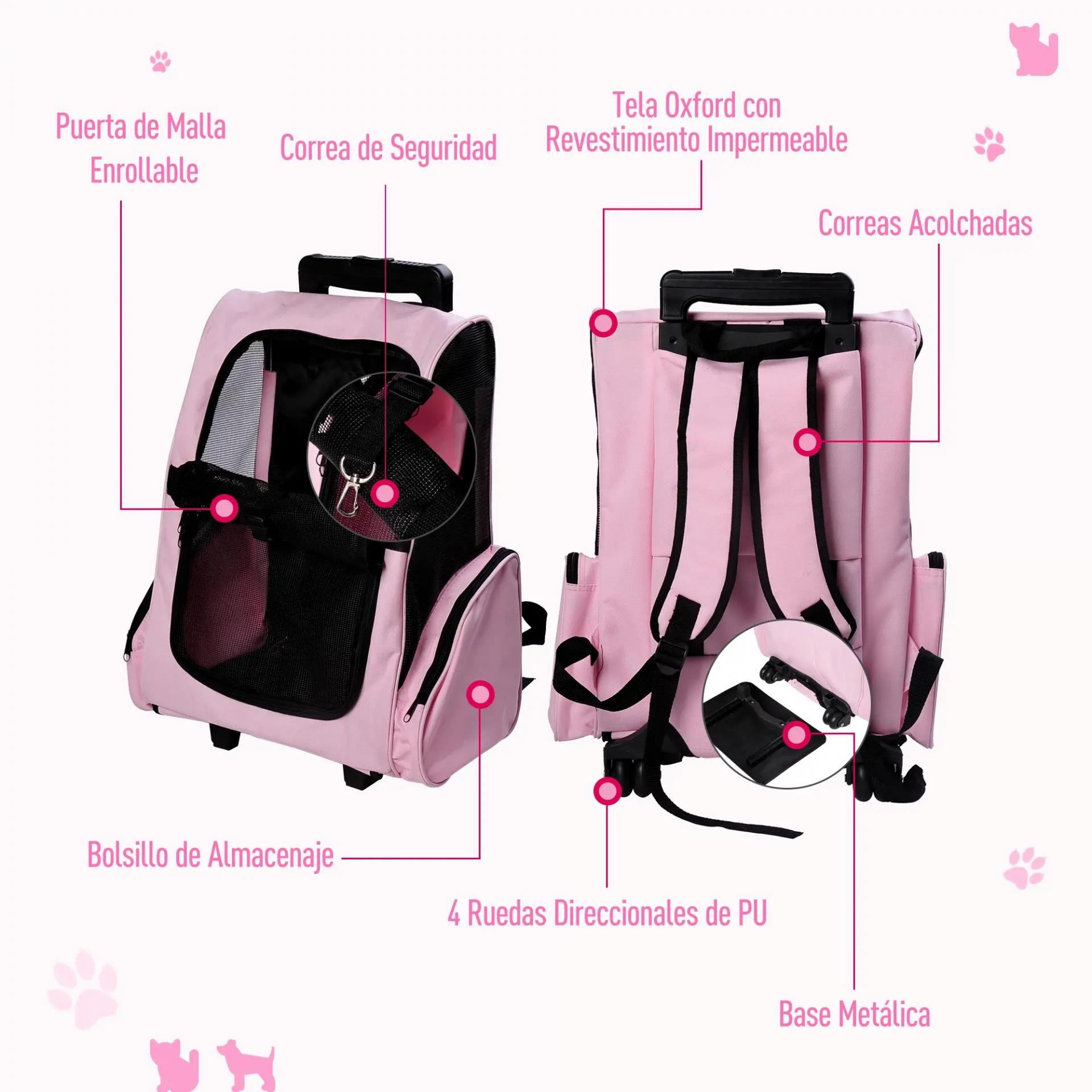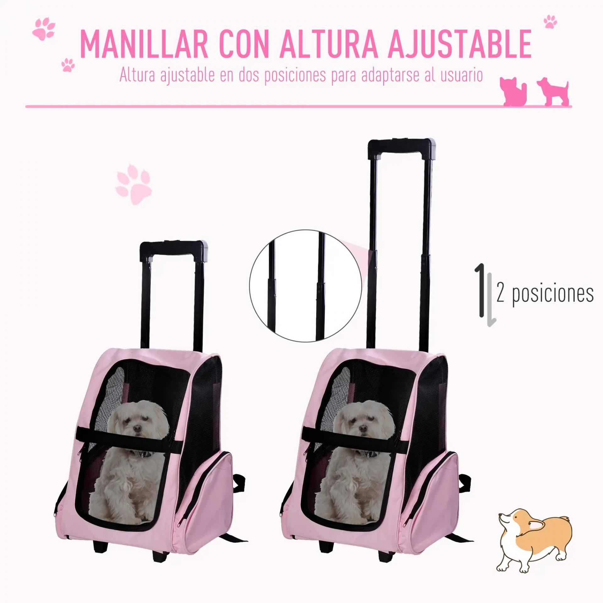 Transportín 2 en 1 para Mascotas Mochila o Carrito de Viaje para Perro y Gato con 2 Ruedas con Asa retráctil de Aluminio y Bolsillos 42x25x55 cm Rosa